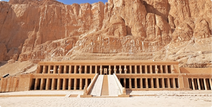 Daarna bewonderen we de imposante tempel van Hatsjepsoet, uniek door haar gedeeltelijke bouw
