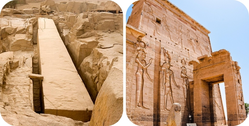 met typische Ptolemeïsche kenmerken zoals pylonen, een binnenplaats en een heilige ruimte.