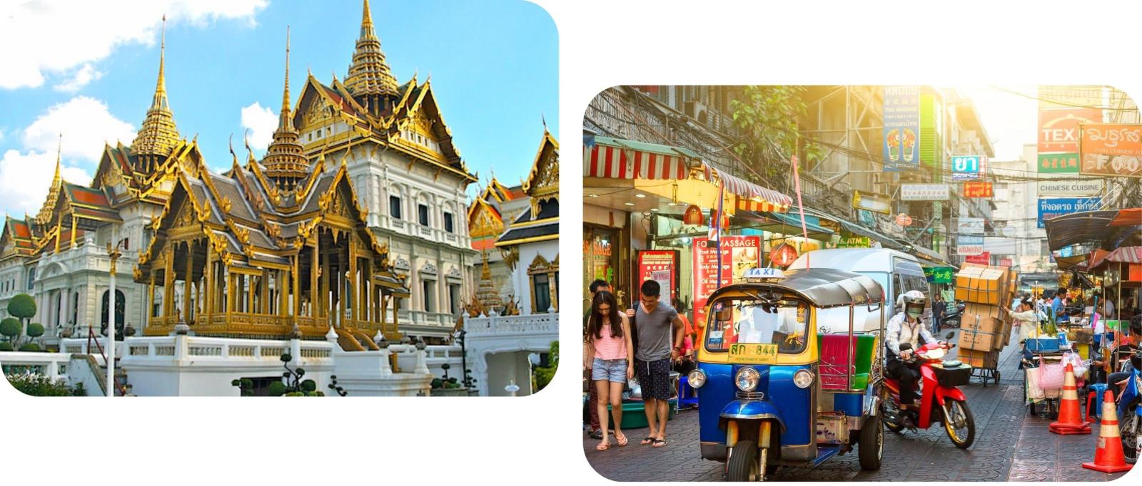 De bruisende stad biedt markten, tempels en moderne winkelcentra, terwijl de Chao Phraya-rivier langs iconische bezienswaardigheden stroomt, zoals Wat Arun en het Koninklijk Paleis.