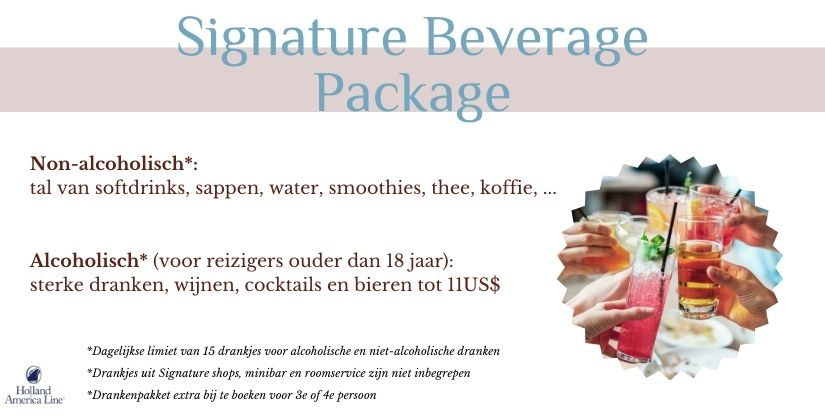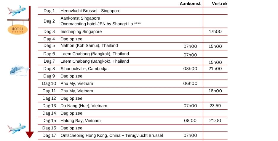 *Internationale vluchten : Brussel – Singapore / Hong Kong – Brussel *Transport van en naar de luchthaven en cruiseschip *1 overnachting in hotel JEN by Shangri La**** te Singapore *15-daagse adembenemende cruise langs de mooiste aanleghavens van Singapore, Thailand, Vietnam en Hong Kong *14 nachten aan boord van het prachtige schip HAL Westerdam *Nederlandstalige begeleider gedurende de volledige reis *Animatie, shows, fitnessruimte en entertainment aan boord *Volpension (ontbijt, lunch, diner in het buffet- én a la carte restaurant) *Have it All *Signature Beverage pakket *Surf Wifi pakket *Voor deze afreis 2 diners in een specialiteiten restaurant *Voor deze afreis 200 USD excursie tegoed per persoon *Crew appreciation (fooien inclusief) *Havengelden en Taxen *Btw en garantiefonds