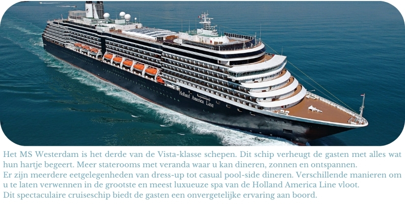 Ontsnap aan de alledaagse drukte en laat jezelf onderdompelen in een wereld van ongekende luxe en verwennerij tijdens deze dag op zee op het knappe & elegante cruise schip WESTERDAM.