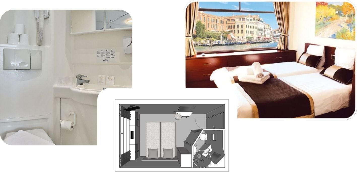 Elke cabine is uitgerust met: douche & wc, haardroger, satelliet-tv, kluisje, individueel regelbare airco, wifi en 220 Volt-stekker