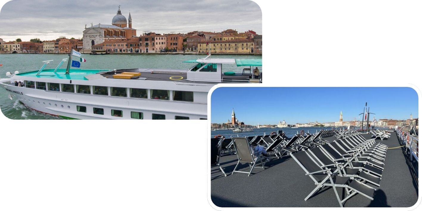 Zonnedek met comfortabele ligstoelen — ideaal voor panoramische vergezichten over Venetië