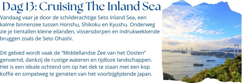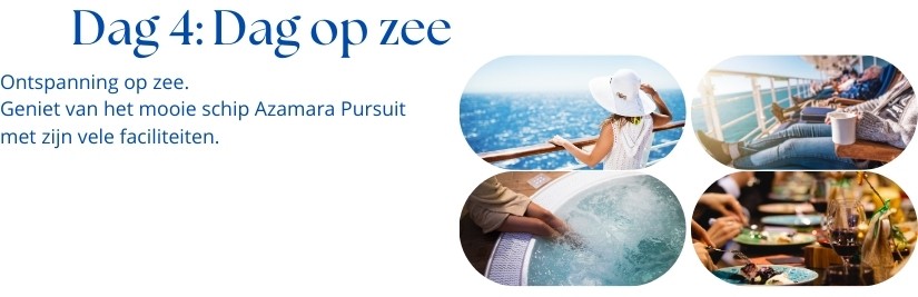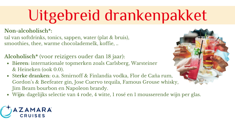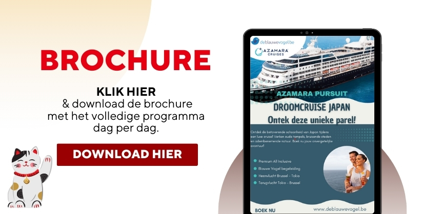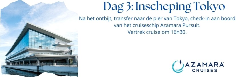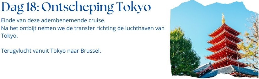 Internationale vluchten : Brussel – Tokio / Tokio – Brussel Transport van en naar de luchthaven en cruiseschip 1 overnachting in hotel **** te Tokio, Japan met ontbijt 16-daagse adembenemende cruise langs de mooiste aanleghavens van Japan en Zuid-Korea 15 nachten aan boord van het prachtige schip Azamara Pursuit Nederlandstalige begeleider gedurende de volledige reis Animatie, shows, fitnessruimte en entertainment aan boord Volpension tijdens cruise (ontbijt, lunch, diner in het à la carte restaurant) Fooien Azamazing Evening Uitgebreid drankenpakket Havengelden en Taxen Btw en garantiefonds