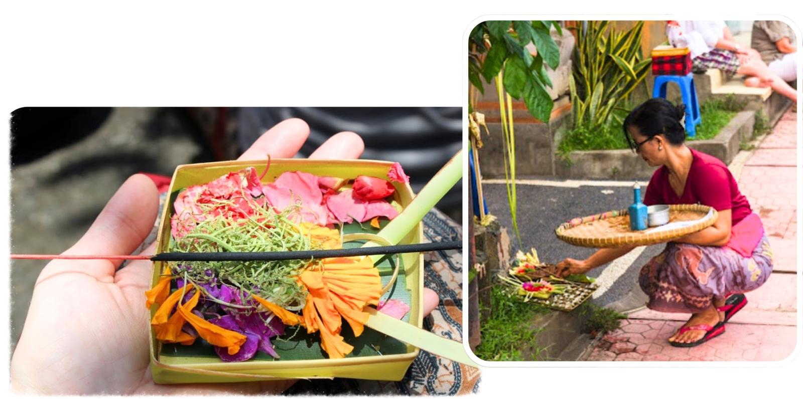 Om die balans te behouden, brengen ze dagelijks offers – kleine mandjes gemaakt van palmbladeren, gevuld met bloemen, rijst, koekjes, en wierook.