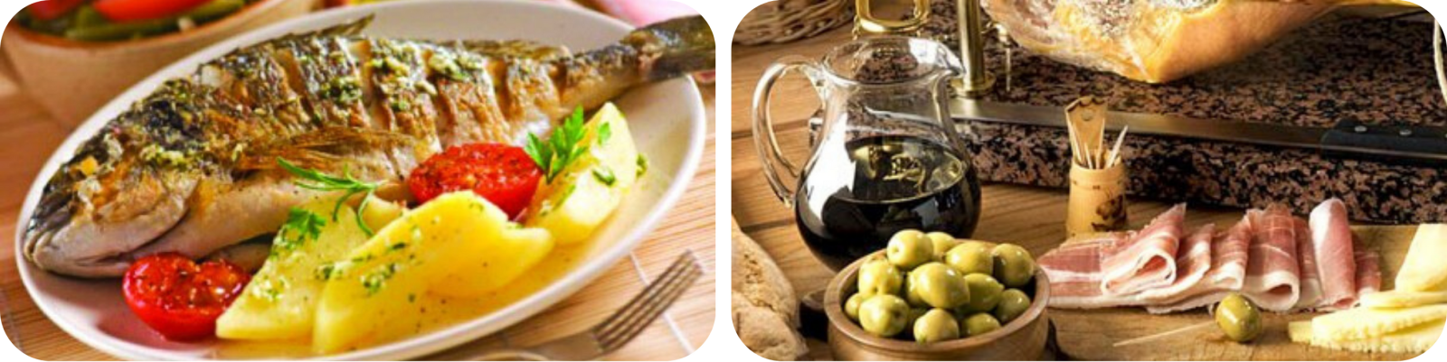 Brav u Mlijeku, Njeguski steak, Buzara, Njegusi Prosciutto, Priganice, Kotorska Torta en Montenegrijnse kazen.