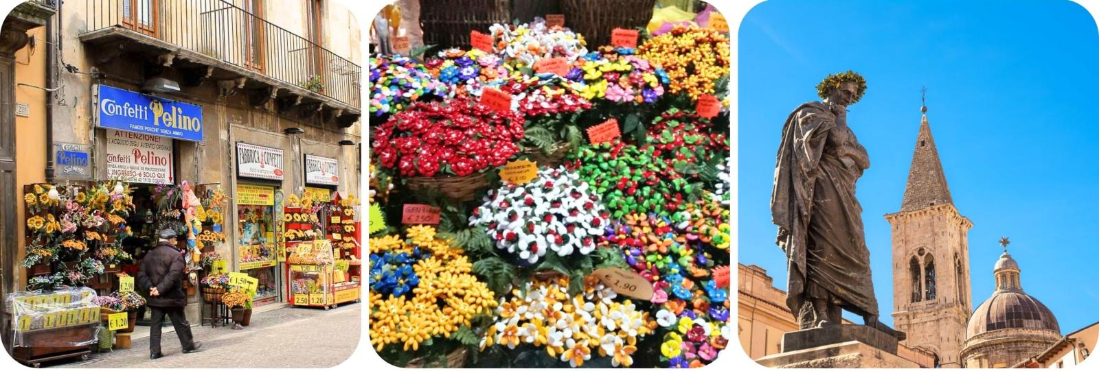Wat opvalt zijn niet alleen de gebouwen maar de talloze kleurrijke etalages waarin de meest beroemde schatten van de stad worden uitgestald: de bitterzoete confetti van Sulmona of gesuikerde amandelen.