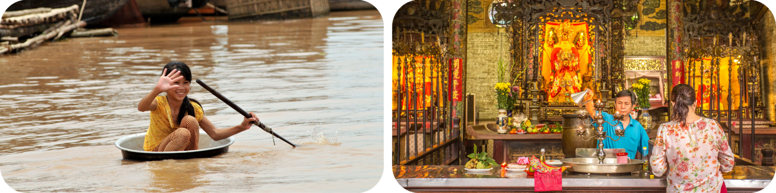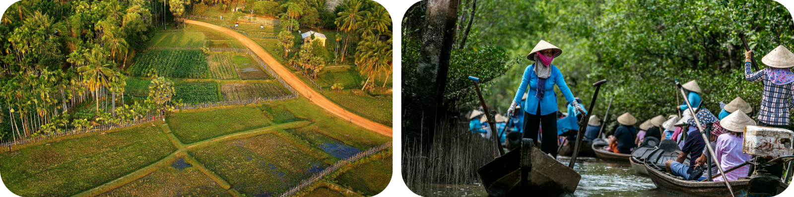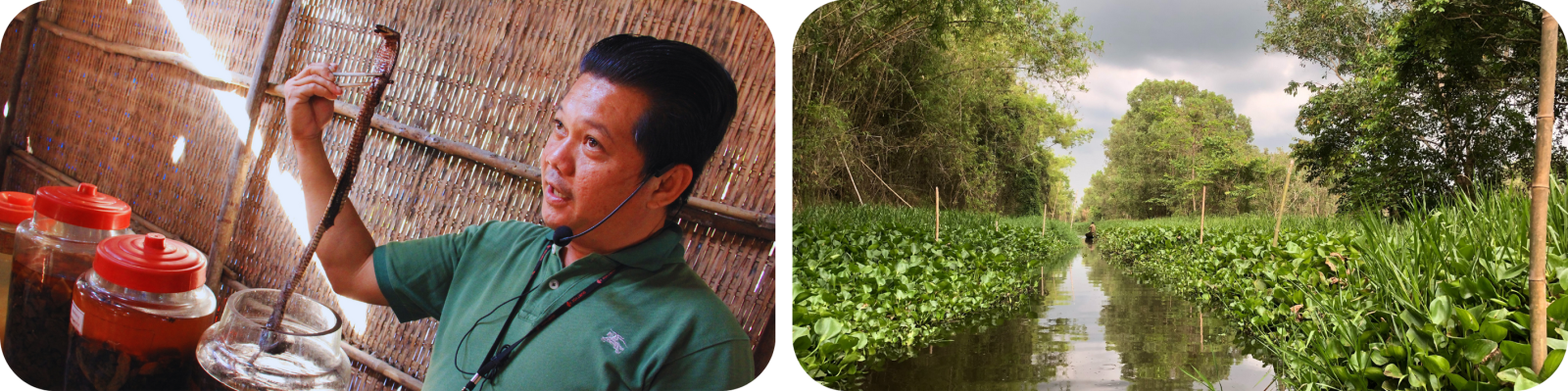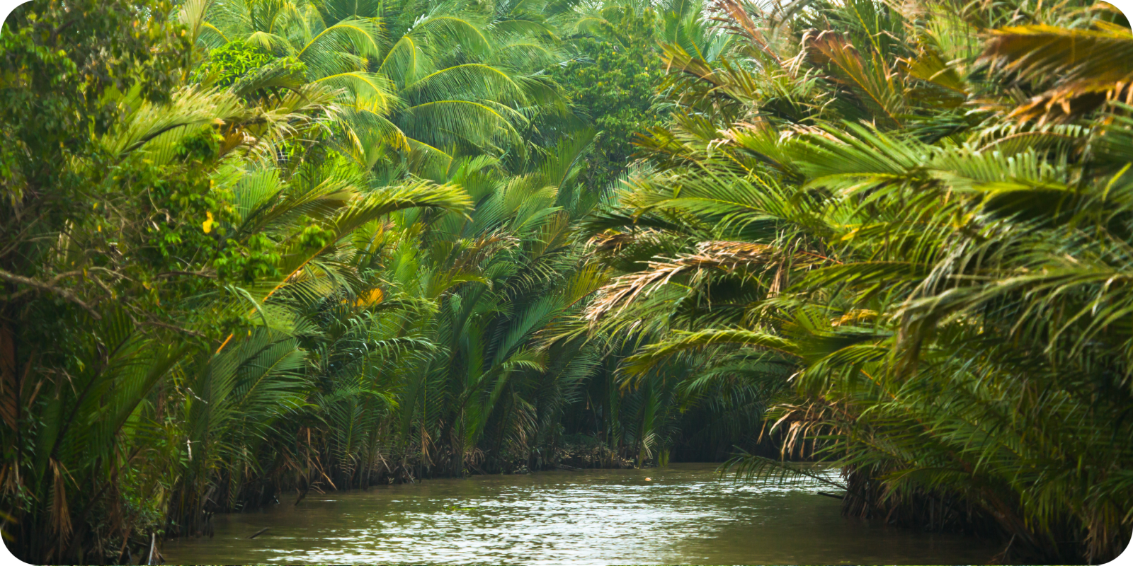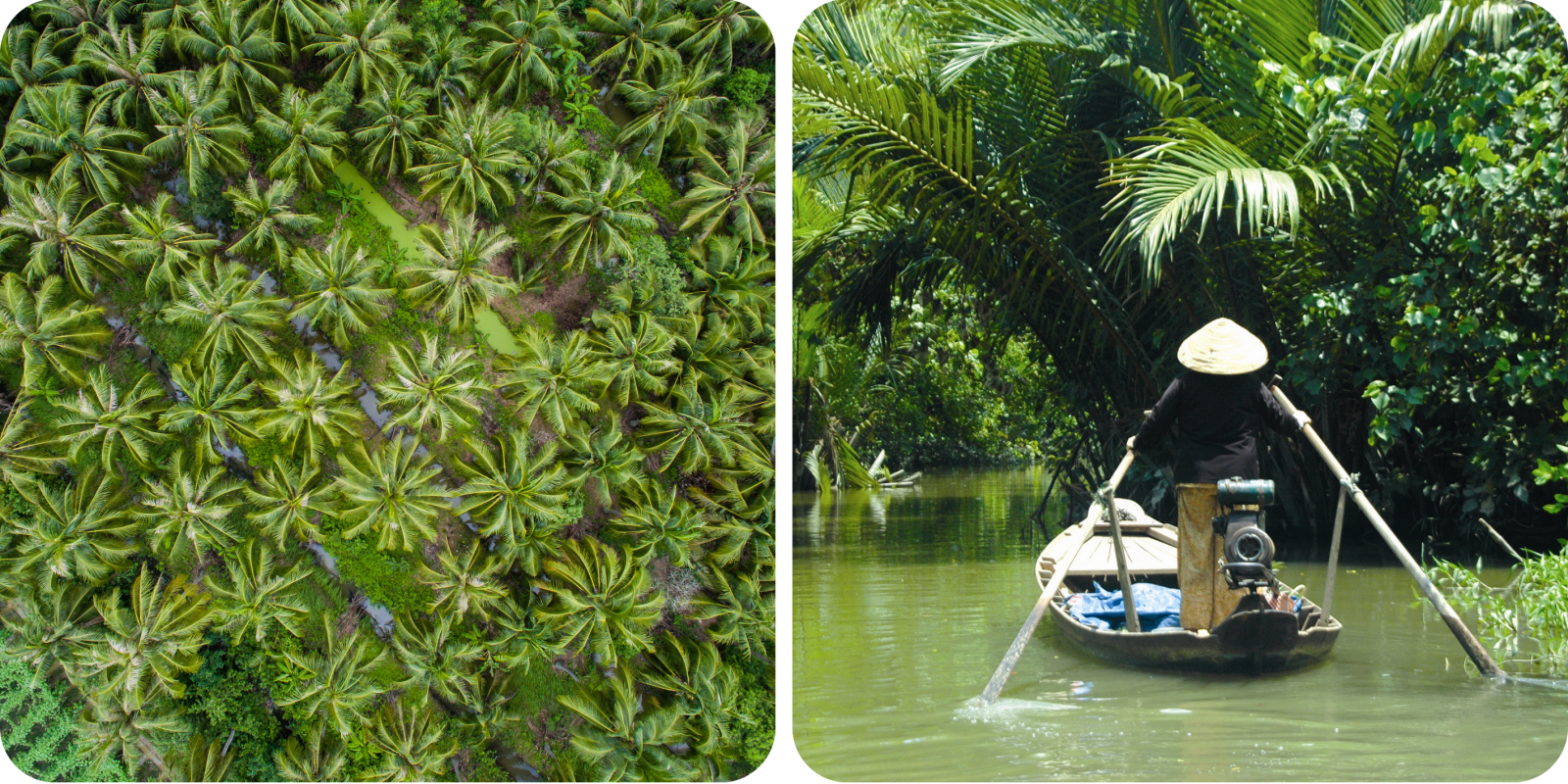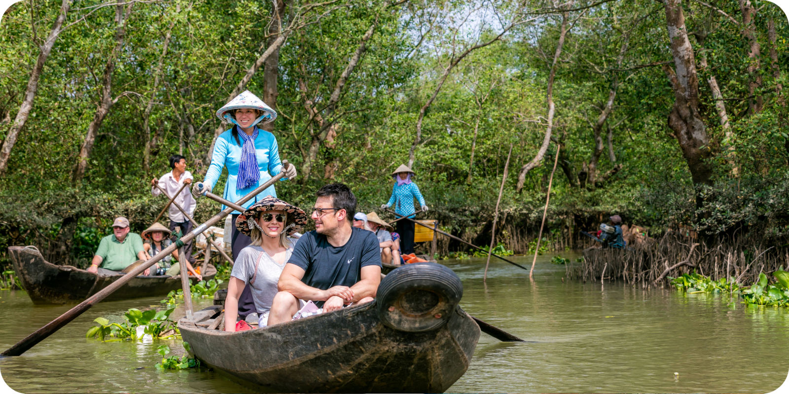 Na de lunch reizen we per sampans door mangroven en bamboebossen naar de fruitboomgaarden van Ben Tre.