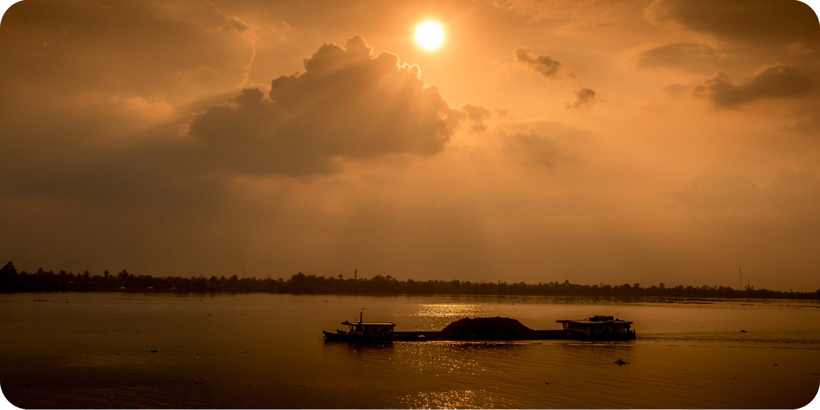 Het schip vaart naar Ben Tre voor een excursie aan wal.