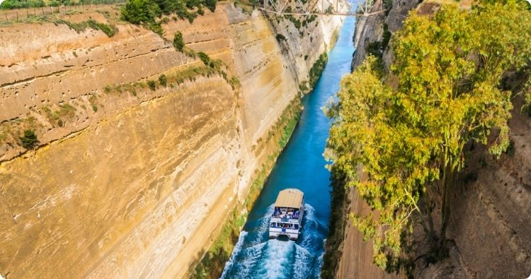 Het kanaal van Korinthië is een indrukwekkend technisch meesterwerk dat het Griekse vasteland scheidt van de Peloponnesos.