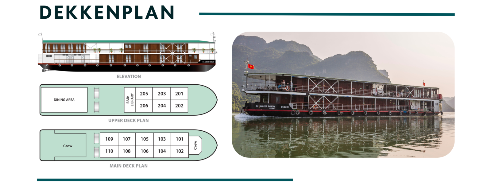 Twee dekken, met 6 kajuiten op het bovendek en 10 op het hoofddek