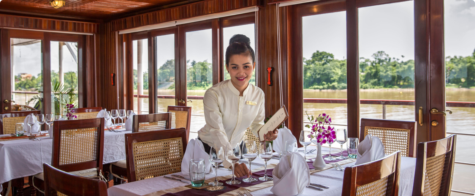 Welkom aan boord van de R/V Angkor Pandaw, een karaktervol boutique schip met slechts 16 buitengeoriënteerde kajuiten.