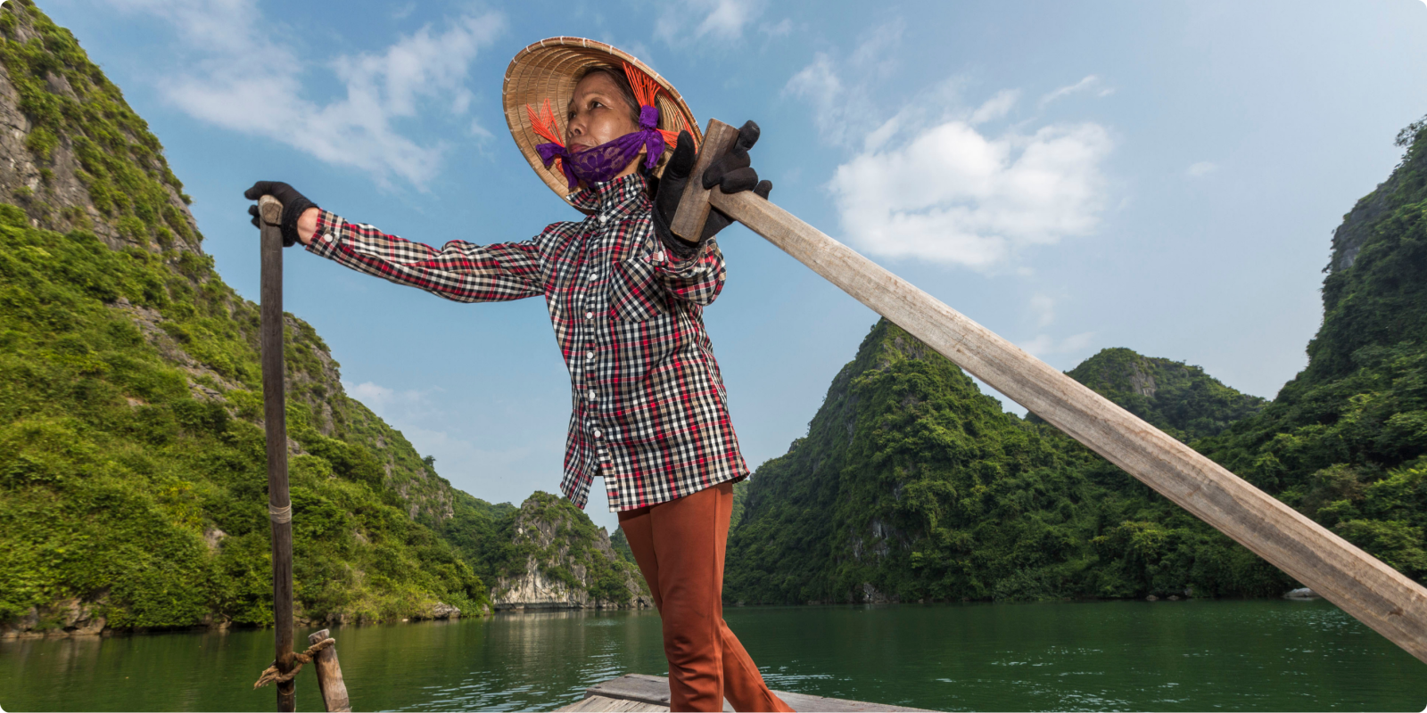 In kleine bamboe roeibootjes glijden we door een landschap van majestueuze kalkstenen grotten en stille waterwegen.