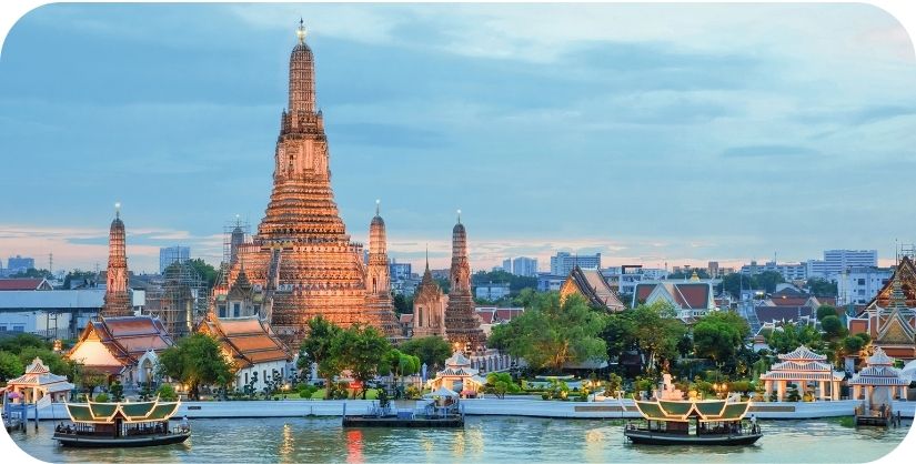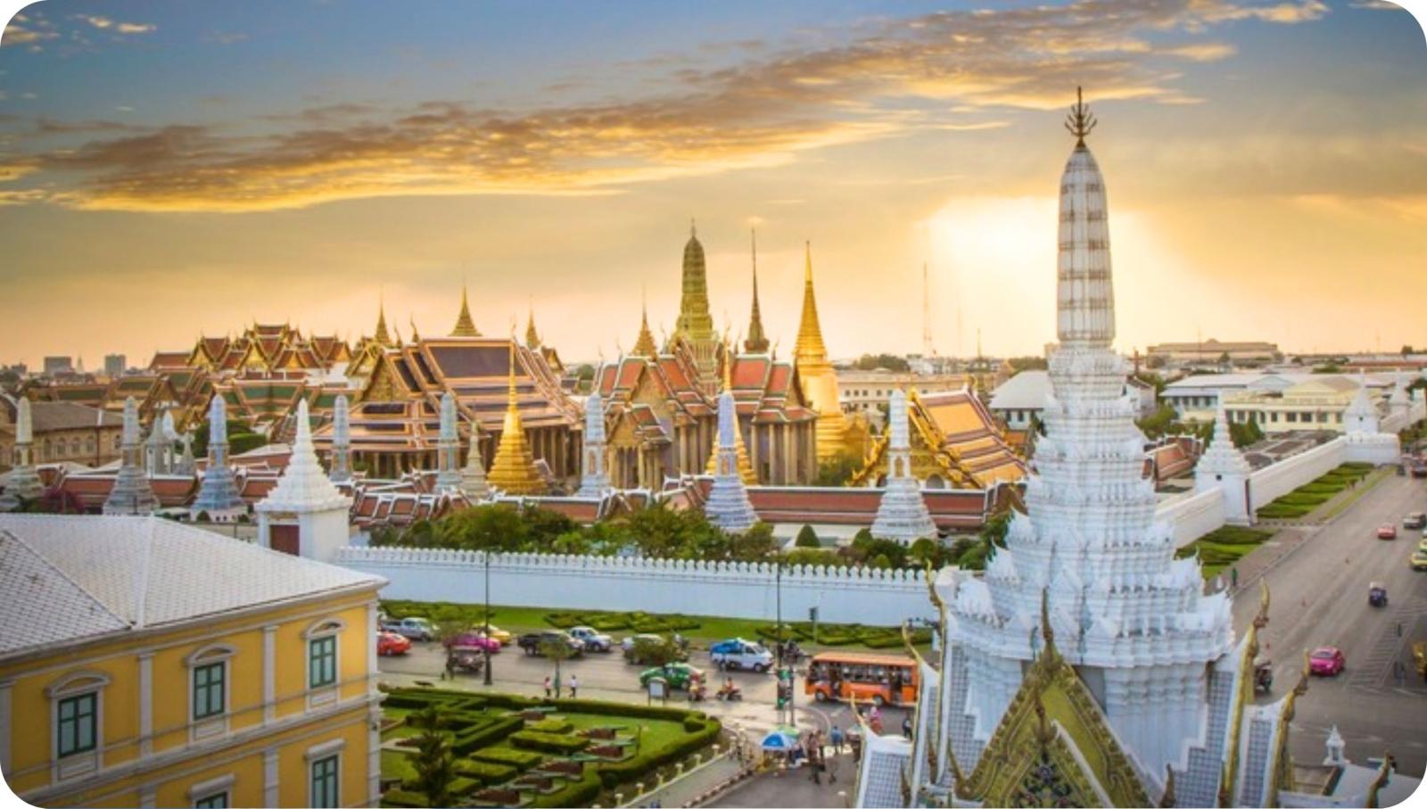 De bruisende stad biedt markten, tempels en moderne winkelcentra, terwijl de Chao Phraya-rivier langs iconische bezienswaardigheden stroomt, zoals Wat Arun en het Koninklijk Paleis.