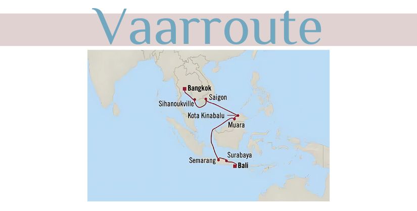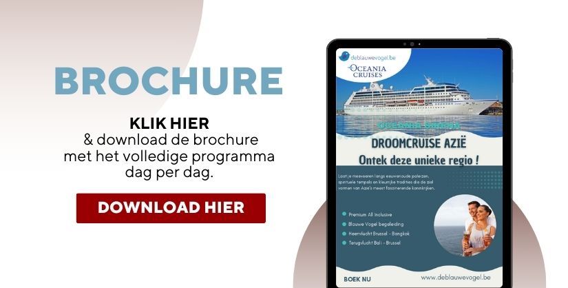 *Internationale vluchten : Brussel – Bangkok / Bangkok – Brussel via Dubai *Transport van en naar de luchthaven en cruiseschip *1 overnachting met ontbijt in hotel **** te Bangkok voor de cruise *2 overnachtingen met ontbijt in hotel Nusa Dua***** te Bali na de cruise *15-daagse adembenemende cruise langs de mooiste aanleghavens van Thailand, Vietnam en Indonesië *14 nachten aan boord van het prachtige schip Oceania Sirena *Nederlandstalige begeleider gedurende de volledige reis *Animatie, shows, fitnessruimte en entertainment aan boord *Volpension tijdens cruise (ontbijt, lunch, diner in het à la carte restaurant) *Inclusief wijn, bier & champagne tijdens lunch en diner *$250 boordtegoed per hut *Your World Included *Gastronomische specialiteitenrestaurants *24u in stateroom/suite roomservice *onbeperkte Starlink Wifi *Frisdranken, vruchtensappen, koffie- en theespecialiteiten *Bruisend of niet-bruisend Vero Water *Vers bereide smoothies of ijsspecialiteiten *Fitnesslessen in groep *Fooien voor het toegewijd personeel *Wasserij Service *Butler service (suites) *Havengelden en Taxen *Btw en garantiefonds