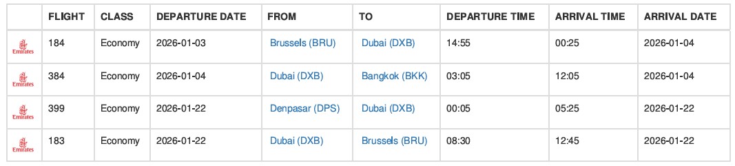 Rond middernacht (nacht van dag 19 op 20) vertrek je vanuit Bali richting Brussel, met een tussenstop in Dubai.
