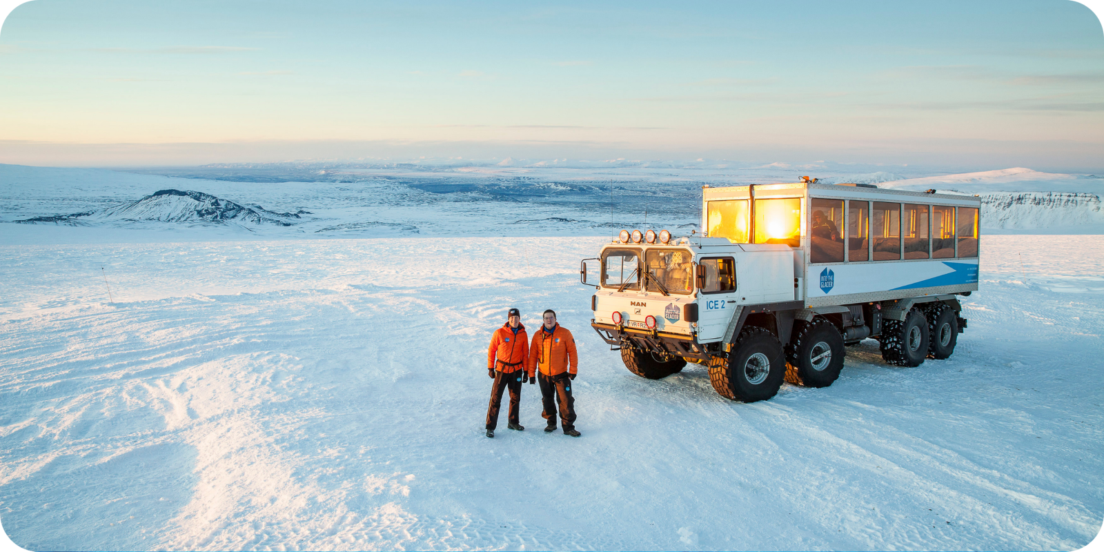 We rijden met een speciaal uitgeruste truck een eind op de gletsjer en ontdekken de besneeuwde ijskap.