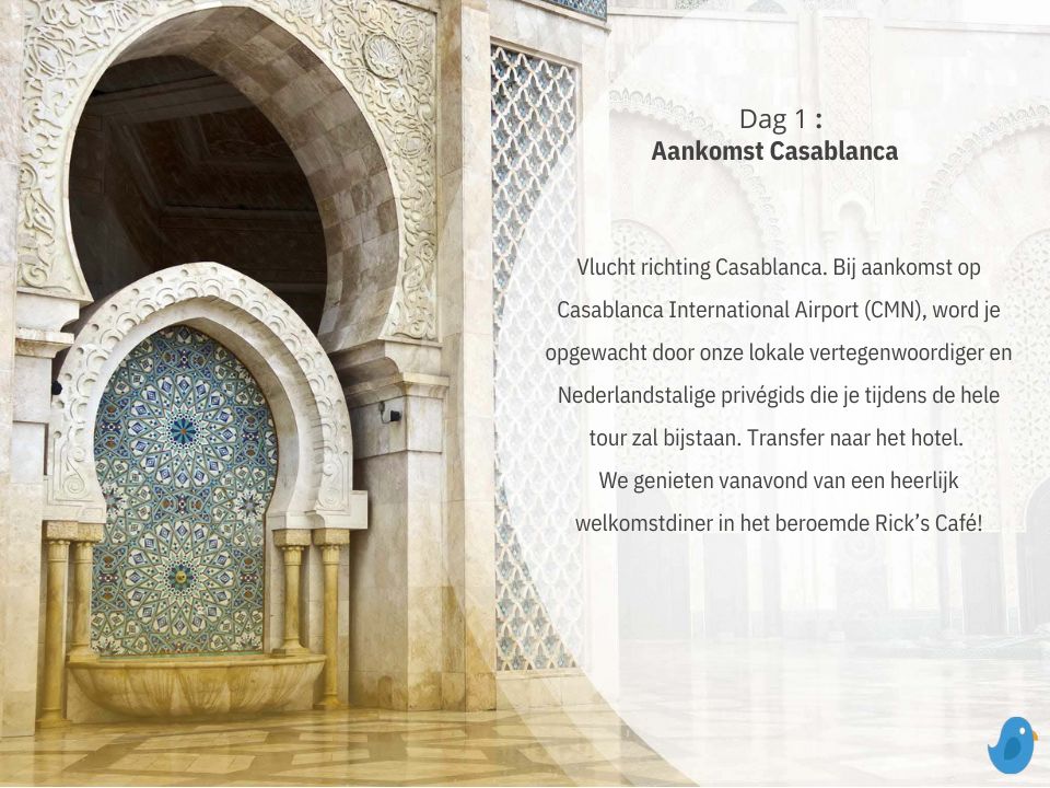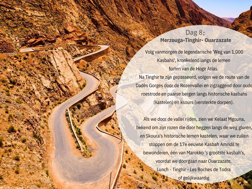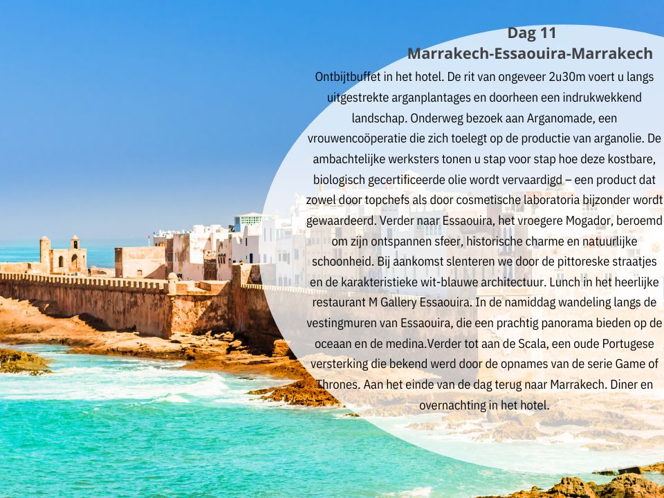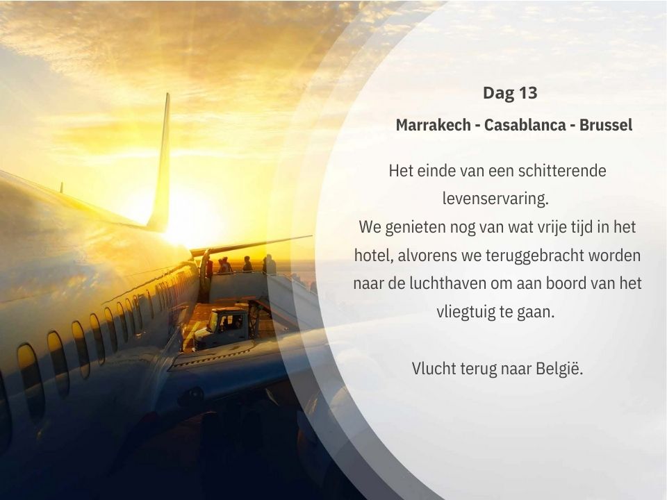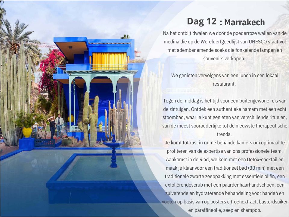* Vluchten vanuit Brussel * 5 * * * * * hotels gedurende de rondreis * excursies en inkomgelden * Nederlandstalige gids ter beschikking de hele rondreis ter plaatse * De diensten van een deskundige lokale, Engelssprekende gids ter plaatse * Bijzonder complete totaal-rondreis * Verblijf in geselecteerde accommodaties (één 4**** Superior en 5*****) * Volpension; 11 lunches en 3 diners in lokale restaurants volgens het programma 8 topdiners in de verschillende hotels * Rondleiding door de Hassan II-moskee, één van 's werelds grootste en hoogste moskeeën * 4WD Sahara Desert-safari (5 Pax per voertuig) en kameelrit bij zonsondergang * Iconische 'Weg van 1.000 Kasbahs' * Bezoek de 1000 jaar oude Aït Benhaddou, die op de werelderfgoedlijst van UNESCO staat * Verken de 11e-eeuwse Djemaa El Fna-markt * Reis naar het Yves Saint Laurent Museum en de Majorelletuin * Slaap onder de sterren in luxe tenten in de Sahara * Sluit je tour af met een pure tijd van ontspanning in een traditionele Marokkaanse hammam en massage * Alle transfers ter plaatse in privévervoer met airconditioning * Alle toegangsprijzen volgens het programma