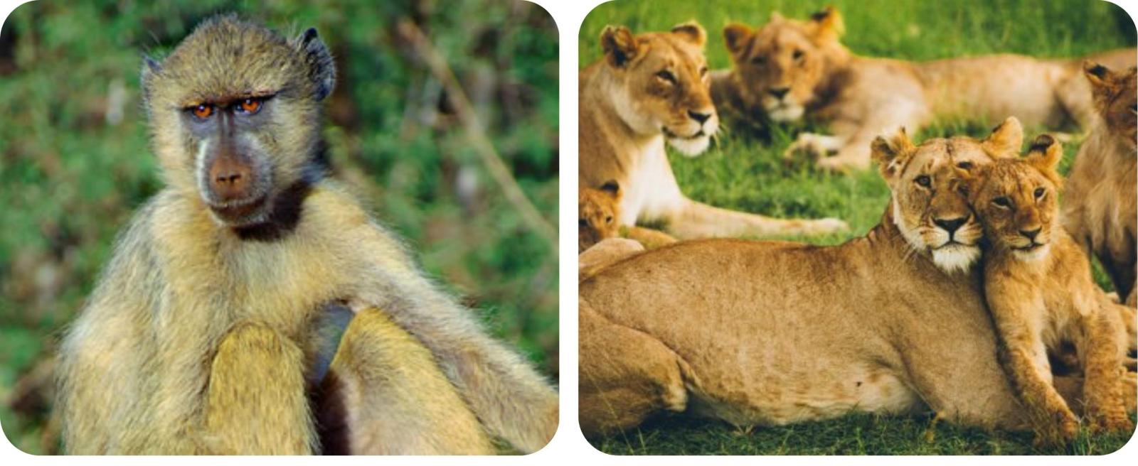 van dichtbij zien: olifanten, zebra’s, gnoes, gazelles, buffels, hyena’s, leeuwen... Rondom het