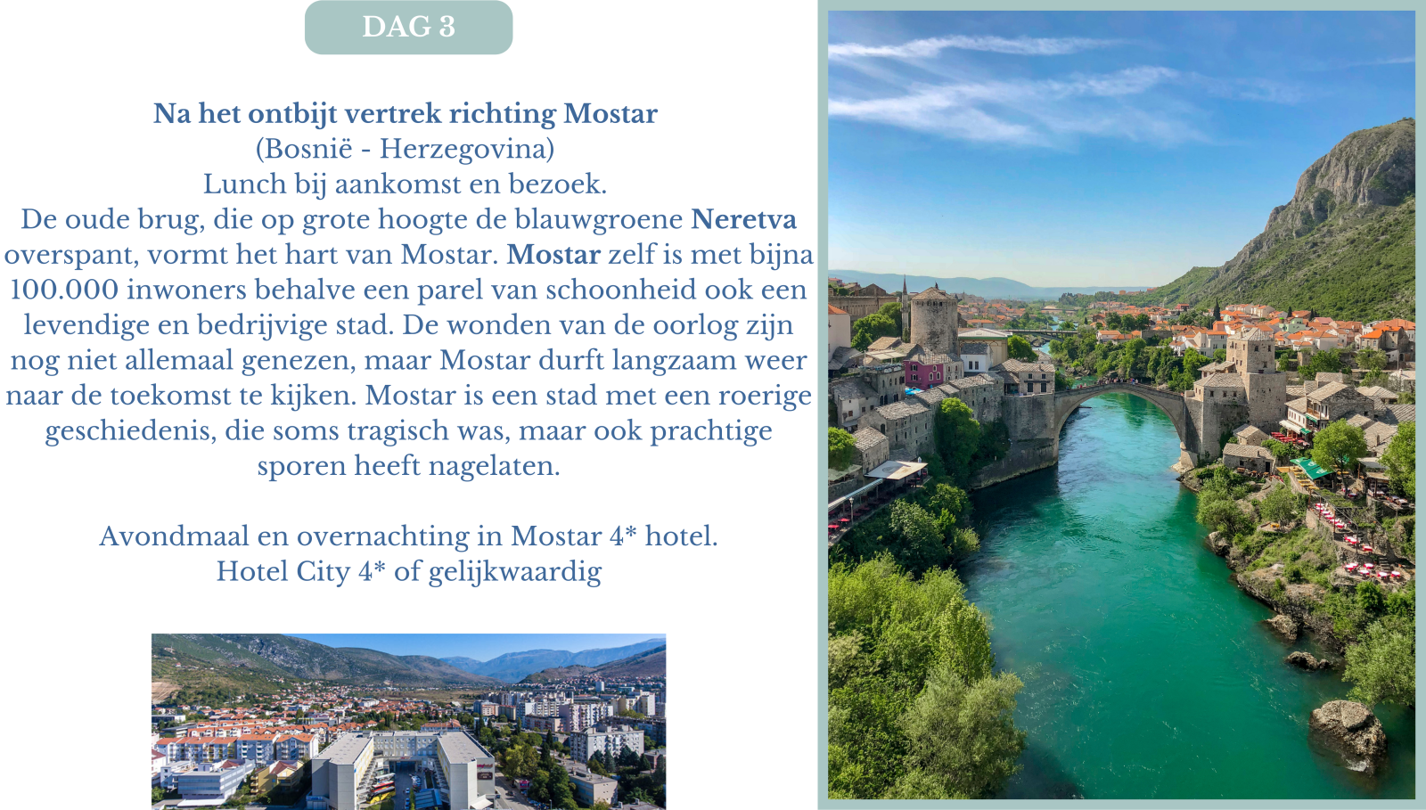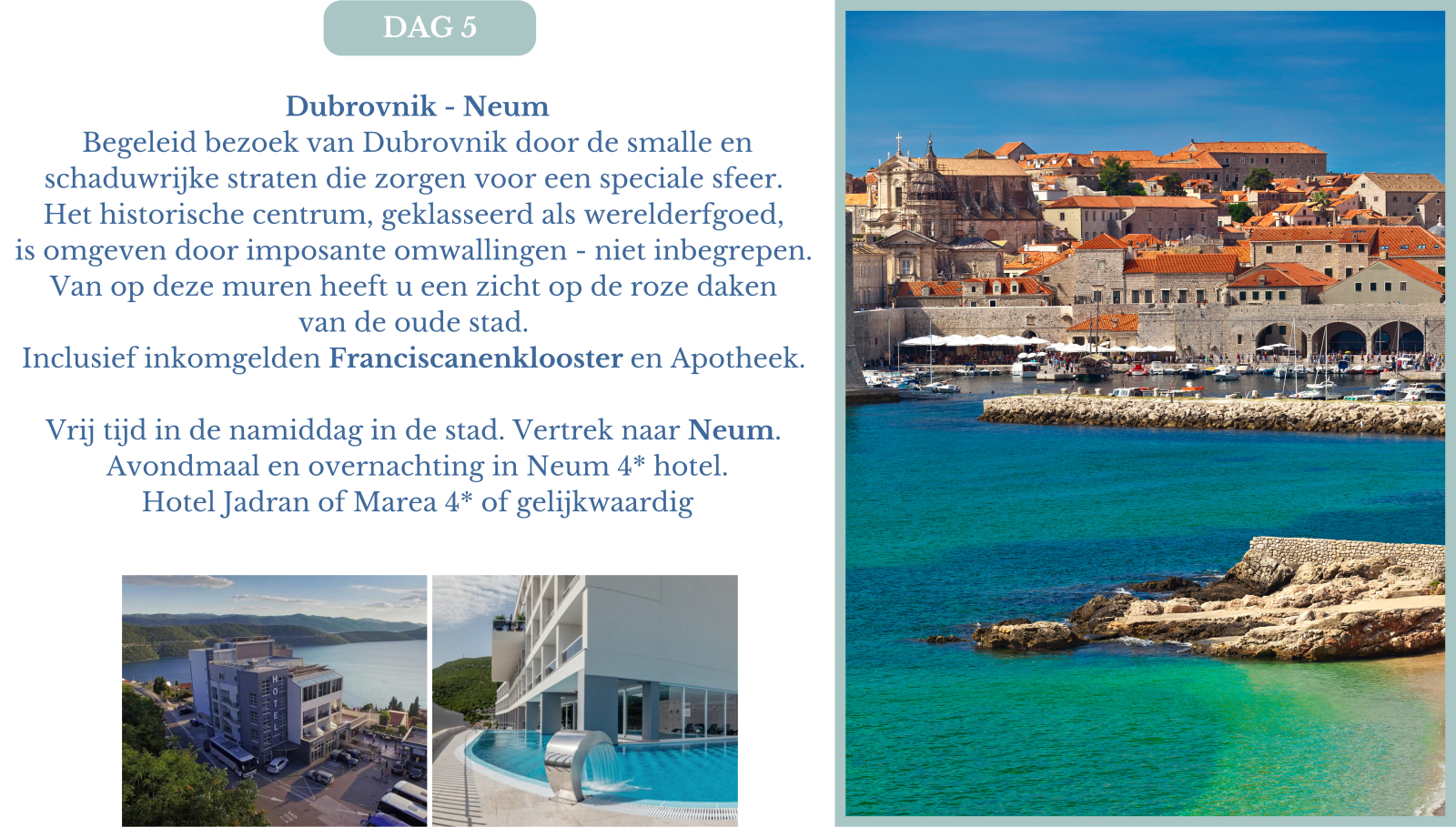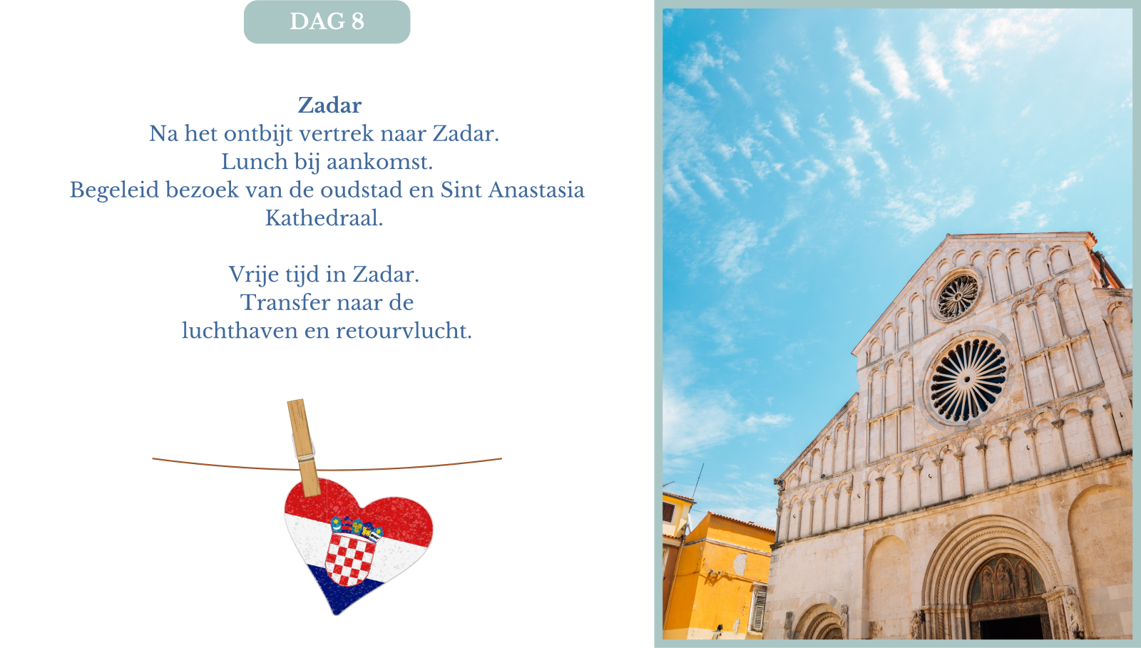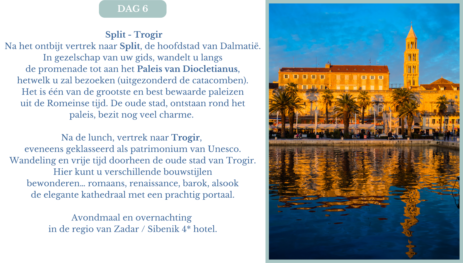* Vliegreis heen / terug RECHTSTREEKS (Brussel -> Kroatië // Kroatië -> Brussel) * Uiterste complete rondreis * Volpension * Drank tijdens de lunch ( water en wijn ) * Alle excursies & inkomgelden * Nederlandstalige gids * Comfortabele airco autocar * Steeds centraal gelegen hotels