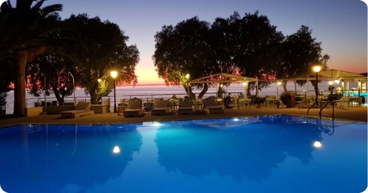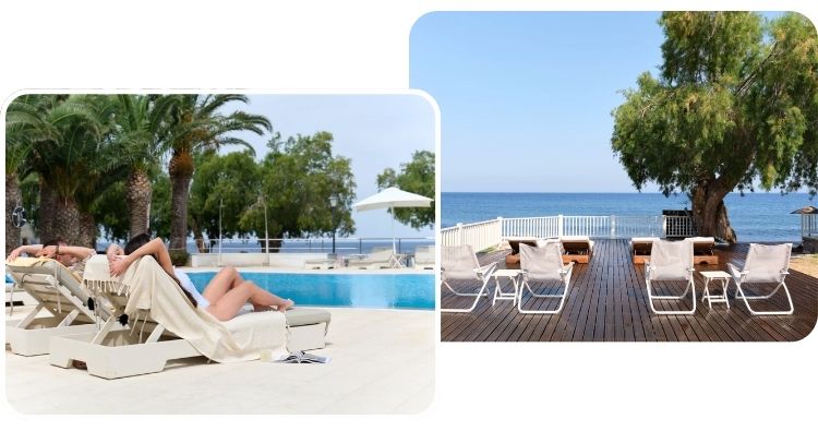 Het hotel bevindt zich direct aan een rustig kiezelstrand, waardoor je vanuit de tuin of het zwembad zo naar zee loopt.