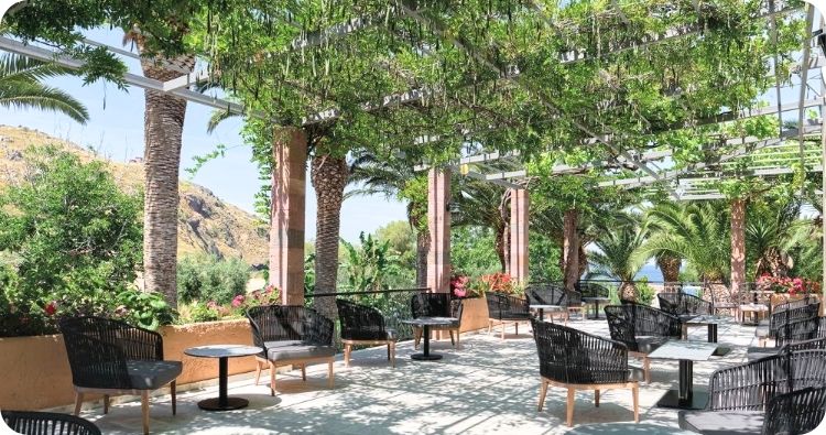 geniet van de Griekse keuken, en ’s avonds tot rust komt tussen palmbomen en olijfgaarden bij Aphrodite Hotel.