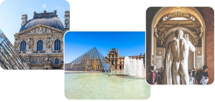 Het gebouw zelf is een architectonisch juweel, waarin klassieke pracht harmonieus samengaat met de moderne glazen piramide aan de ingang.