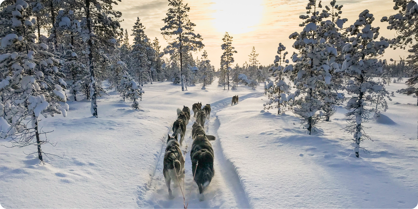 Je doorkruist de mooie natuur met een slee, die wordt voortgetrokken door enkele honden.