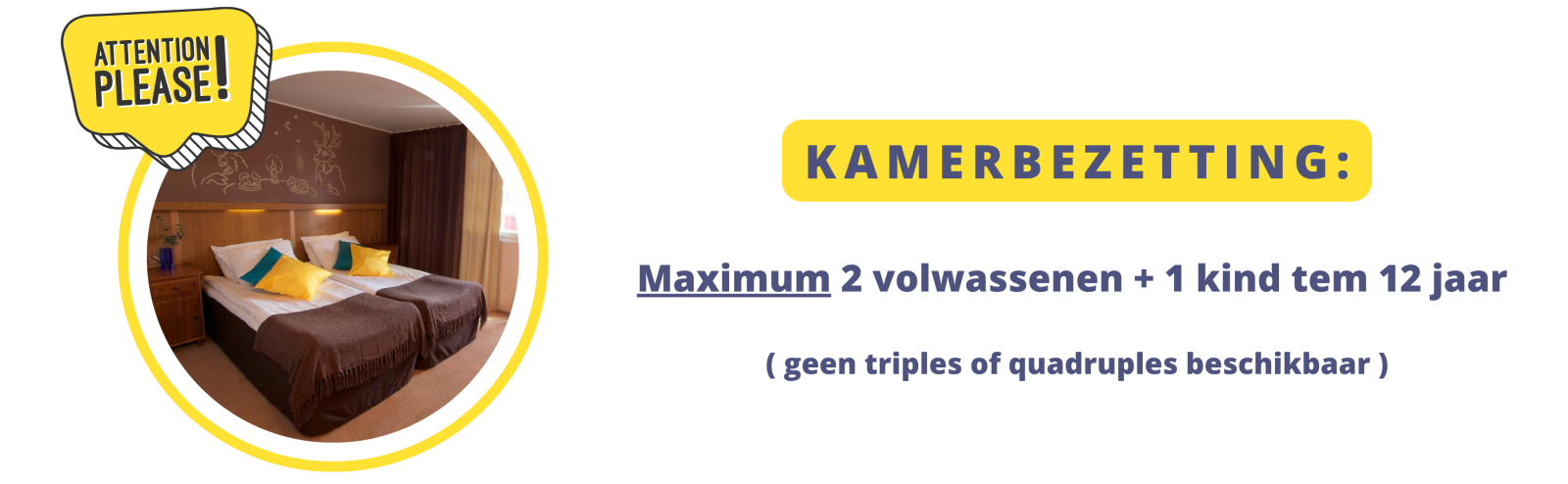 Kinderkorting (tem 12 jaar) : - 180,-€ indien samen met minimaal 2 volwassenen op dezelfde kamer.
