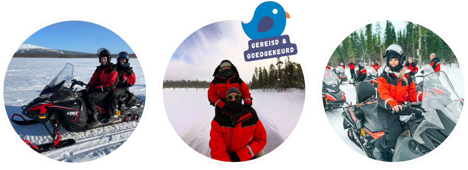 (thermische overall, warme botten, handschoenen, een muts en een helm tijdens de sneeuwscootersafari).