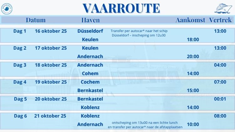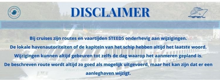 * Autocarreis heen / terug vanuit Vlaanderen * Cruise volgens vaarschema * Buitenkajuit met eigen douche en toilet * welkomst cocktail * Havengelden * Maaltijden op basis van VOLPENSION (!) * NL-talige menu's
