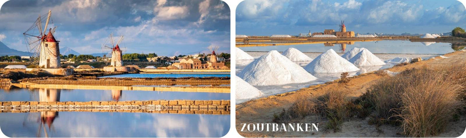 De zoutbanken strekken zich uit van de kustweg van Trapani naar Marsala, langs windmolens en kleine eilandengroepen.