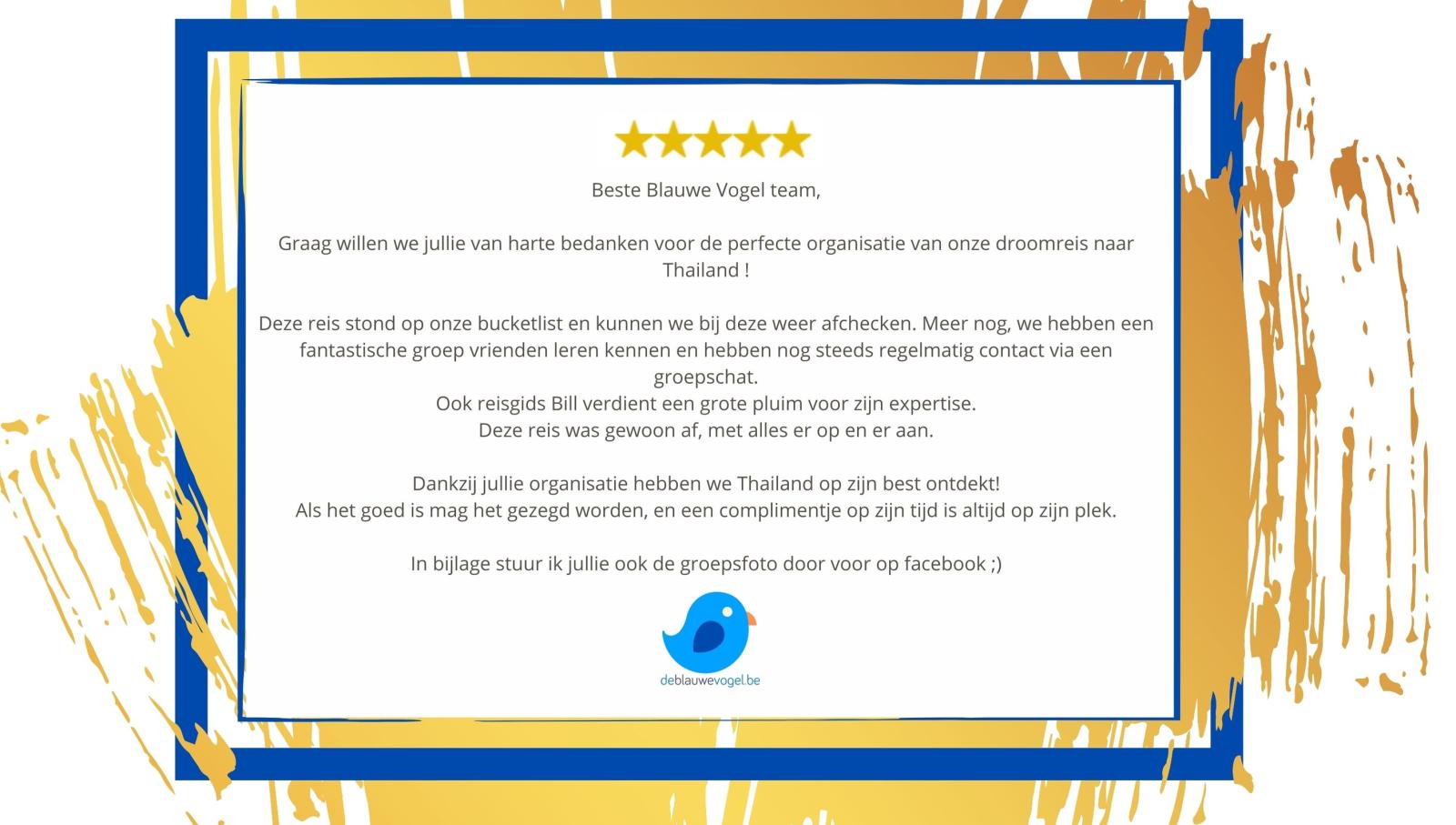 Onder het motto ‘Als het goed is, zeggen we het ook’, willen Erika en ik je laten weten dat de reis die we naar Thailand maakten (vertrek 5 april), tot de mooiste ooit behoort. Hoewel we allebei redelijk bereisd zijn (we reisden op alle continenten meermaals en langdurig) en hoewel ikzelf eerder al in Thailand rondreisde, was deze DBV-reis bijzonder speciaal. Omdat mijn job het niet toestaat om iets “perfect” te noemen ????, wijken we uit naar het predicaat “uitmuntend”. Tot de succesfactoren behoren: