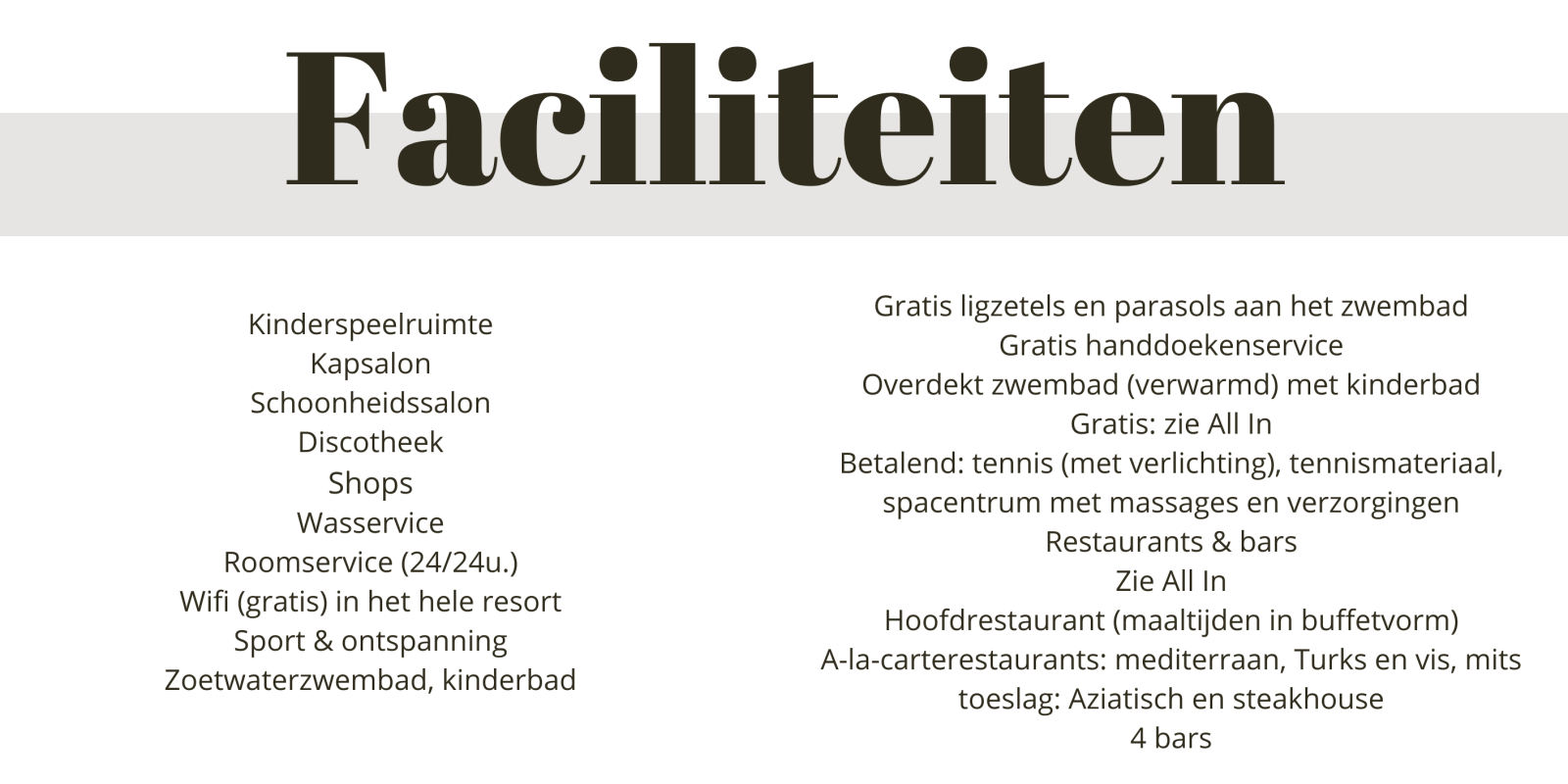 * Vliegreis heen / terug vanuit Brussel * 5 * * * * * hotel * Standaardkamer met alle comfort * Ultra all-inclusive * Transfers ter plaatse van luchthaven naar hotel en van hotel naar luchthaven eveneens inbegrepen (!) * Week-end toeslag * 20 kg bagage & 10 kg handbagage pp