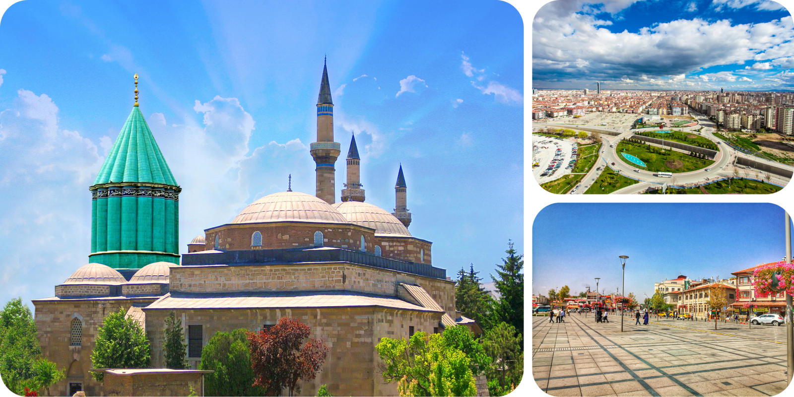 In het centrum ligt het Mevlana klooster met een opmerkelijke blauwgroene koepel met daarnaast de Selimiye moskee.
