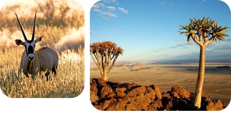 Wildsoorten zoals springbok, gemsbok en struisvogel hebben zich aangepast aan het extreme woestijnklimaat en kunnen hier gespot worden.