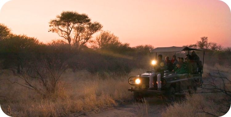 Net voor zonsondergang gaan we per jeep het park in om er, bij het gebrul van de leeuwen, te genieten van de zonsondergang en een aperitief.