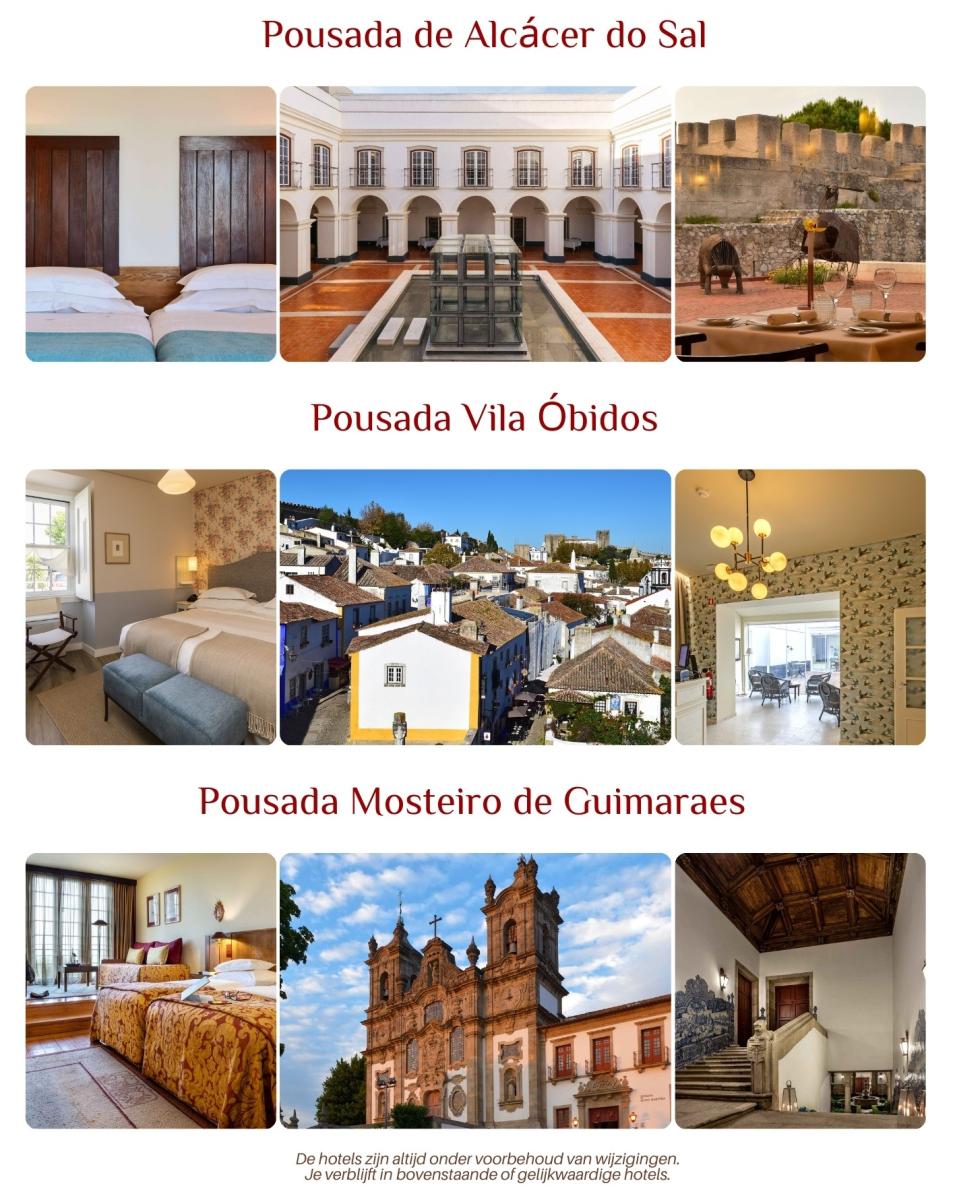 * Vluchten: Brussel – Lissabon / Porto – Brussel met Brussels Airlines * Luxe touringcar gedurende volledig verblijf * Nederlandstalige lokale gids gedurende de volledige reis * 2 overnachtingen in de Pousada te Alcácer do Sal op basis van half pension * 3 overnachtingen in de Pousada te Óbidos op basis van half pension * 3 overnachtingen in de Pousada te Guimarães op basis van half pension * Alle vermelde ingangen en ingangstickets * Audioguidesysteem * BTW, huidige taksen en garantiefonds