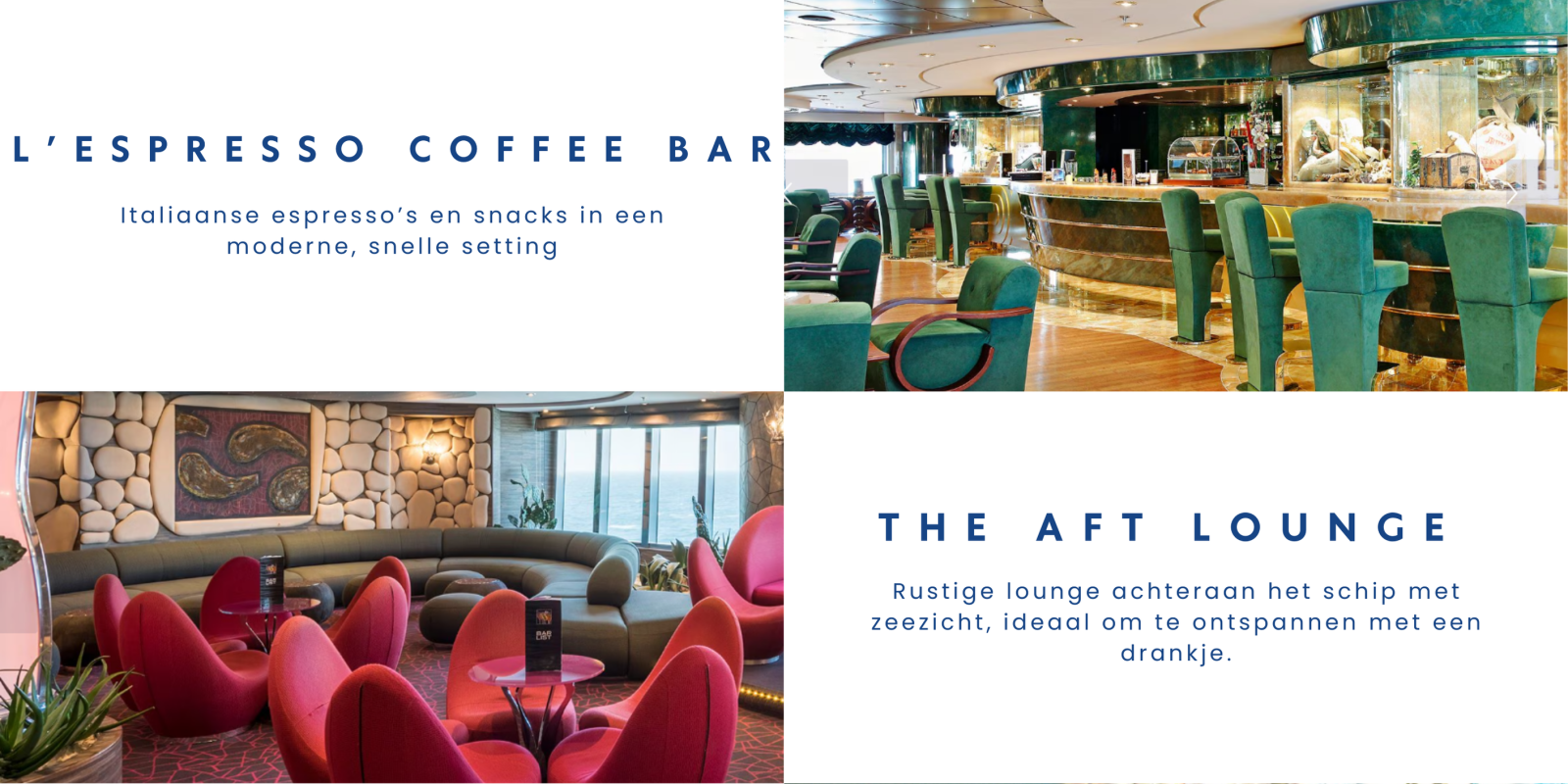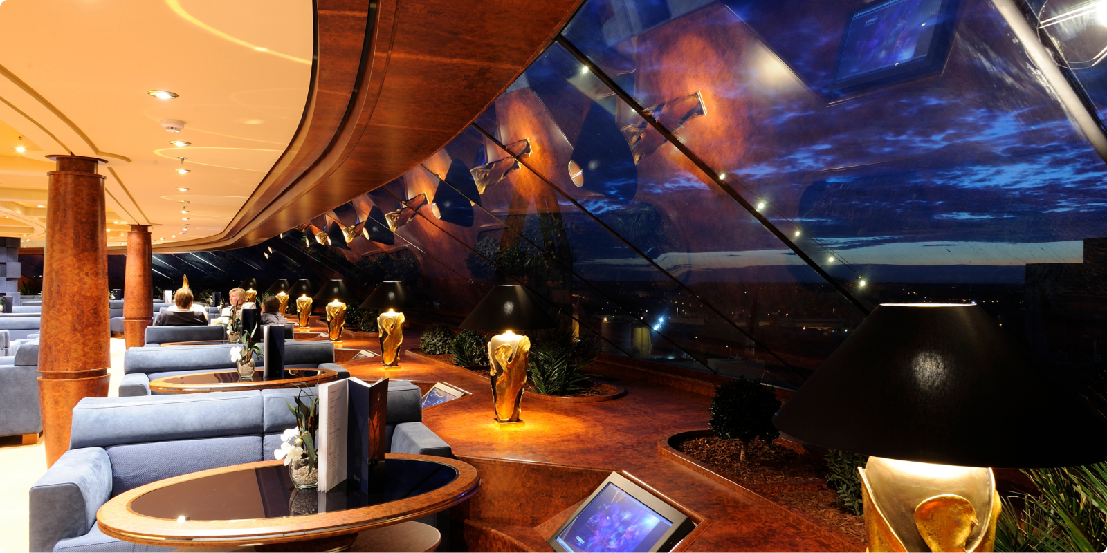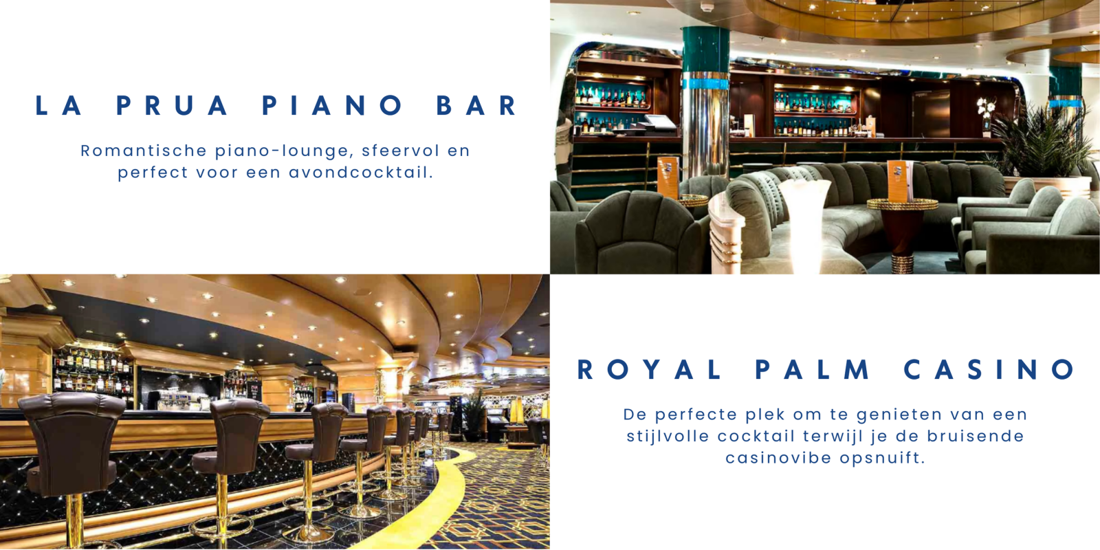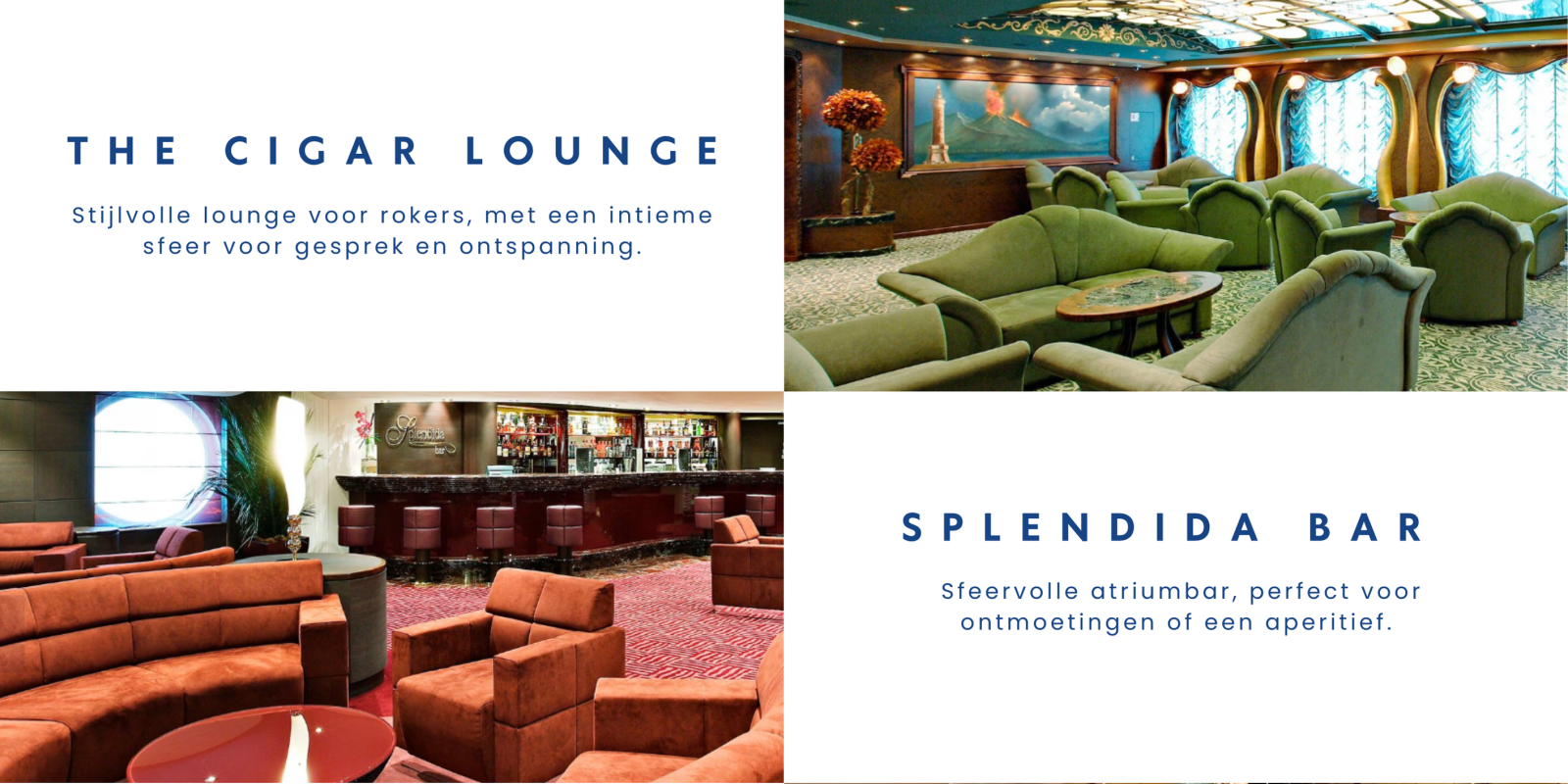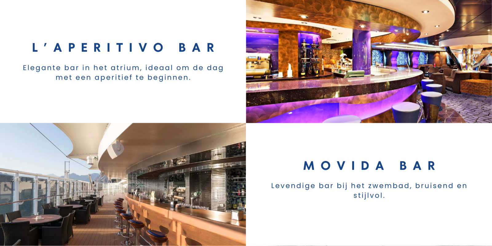 Aan boord vind je een schitterende variatie aan bars en lounges, elk met hun eigen unieke stijl.