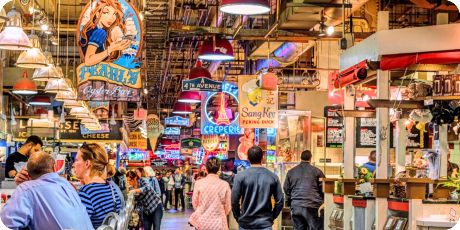 ( een super gezellige " food market " met ontelbaar veel eetstandjes )