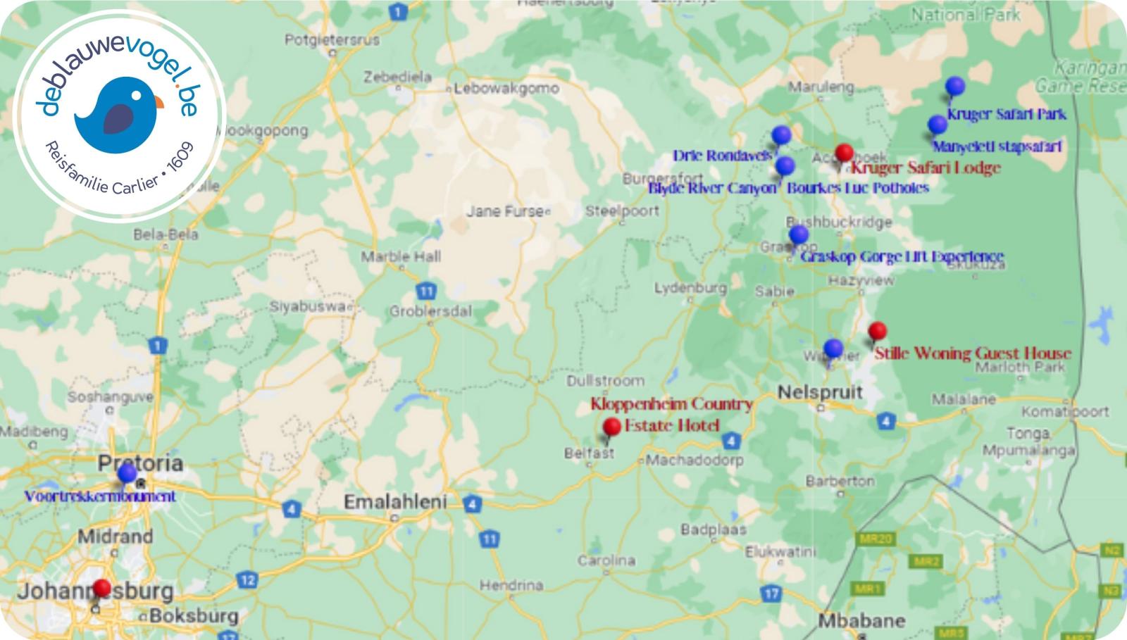 * Vluchten Heen/Terug vanuit Brussel-Zaventem * Nachtvluchten zonder jetlag ! * Zeer gezellig hotel / guesthouse & lodge * Halfpension in Kruger Safari Lodge * Logies & ontbijt in Gooderson Kloppenheim Country Estate Hotel en in Stille Woning Guest House * Excursies en inkomgelden * Alle hoogtepunten * Vlaamse / Afrikaanstalige gids