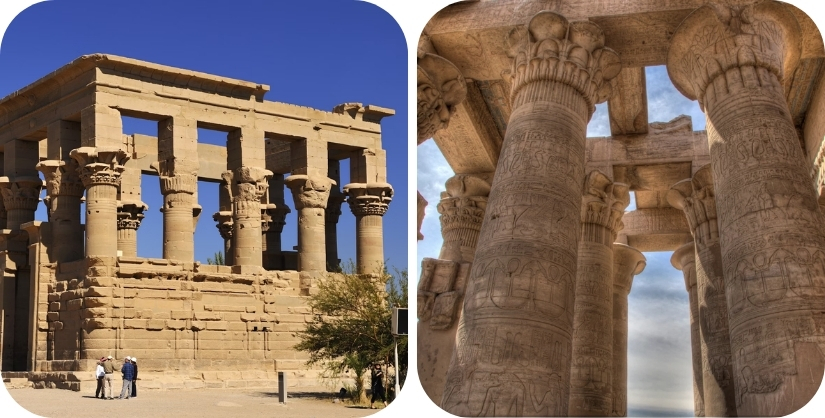 We bewonderen de imposante lotuszuilen, goed bewaarde reliëfs en de nilometer,