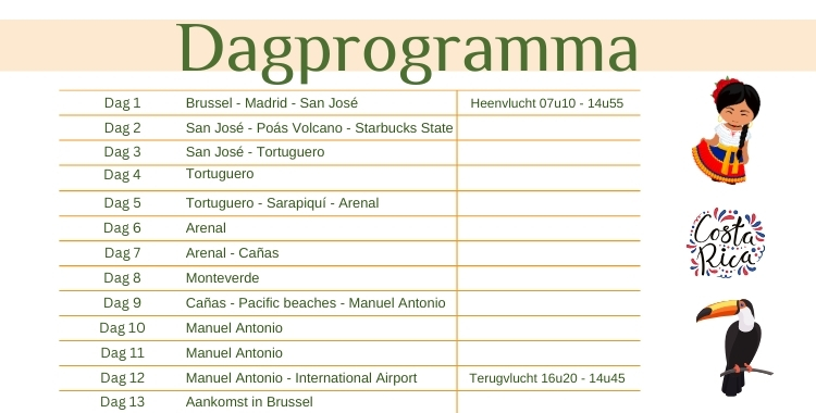 In Costa Rica is het zeven uur (wintertijd) vroeger dan in Belgie. In de zomertijd is het verschil acht uur.