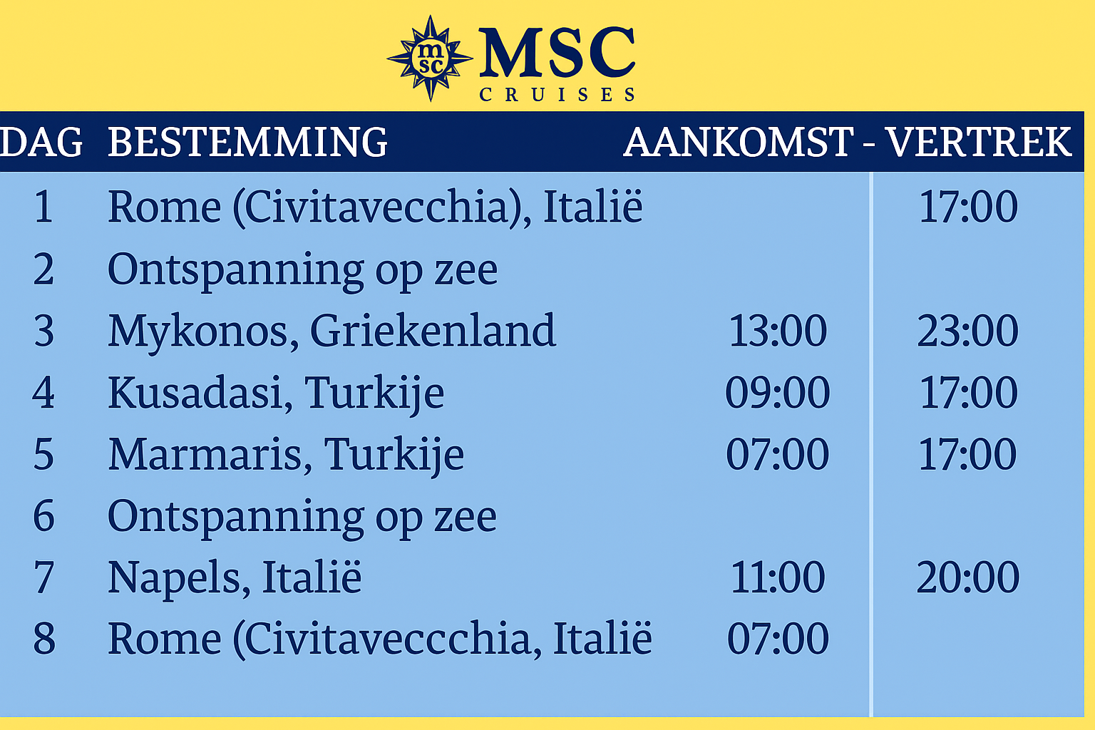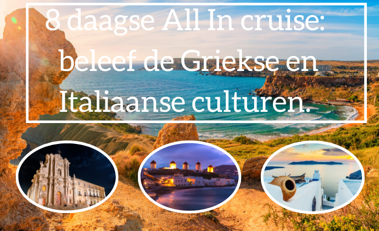 * Vlucht vanuit Brussel naar Rome heen en terug * Luchthaventaksen * Transfer Rome luchthaven naar de haven in Civitaveccia heen en terug * Varen langs de mooiste aanleghavens van Italië, Griekenland en Turkije * 7 nachten aan boord van het elegante schip MSC Divina 4* * Cruise op basis van All Inclusive (buffetten doorlopend open tot 22u) * All In drankenpakket MSC Easy * Havengelden * Fooien aan boord * Elegant diner met de kapitein * Galadiner * Animatie en prachtige shows aan boord