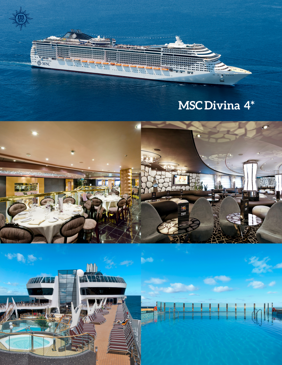 + 2 dagen op zee om te genieten van het mooie en elegante schip MSC Divina 4* met tal van ontspanningsmogelijkheden !