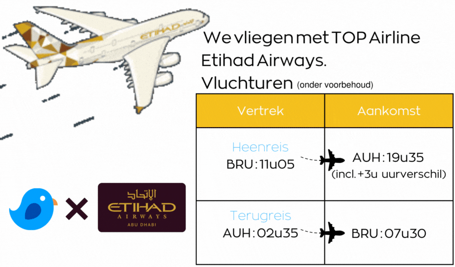 * Lijnvlucht Brussel –Abu Dhabi – Brussel met top airline Etihad Airlines in Economy