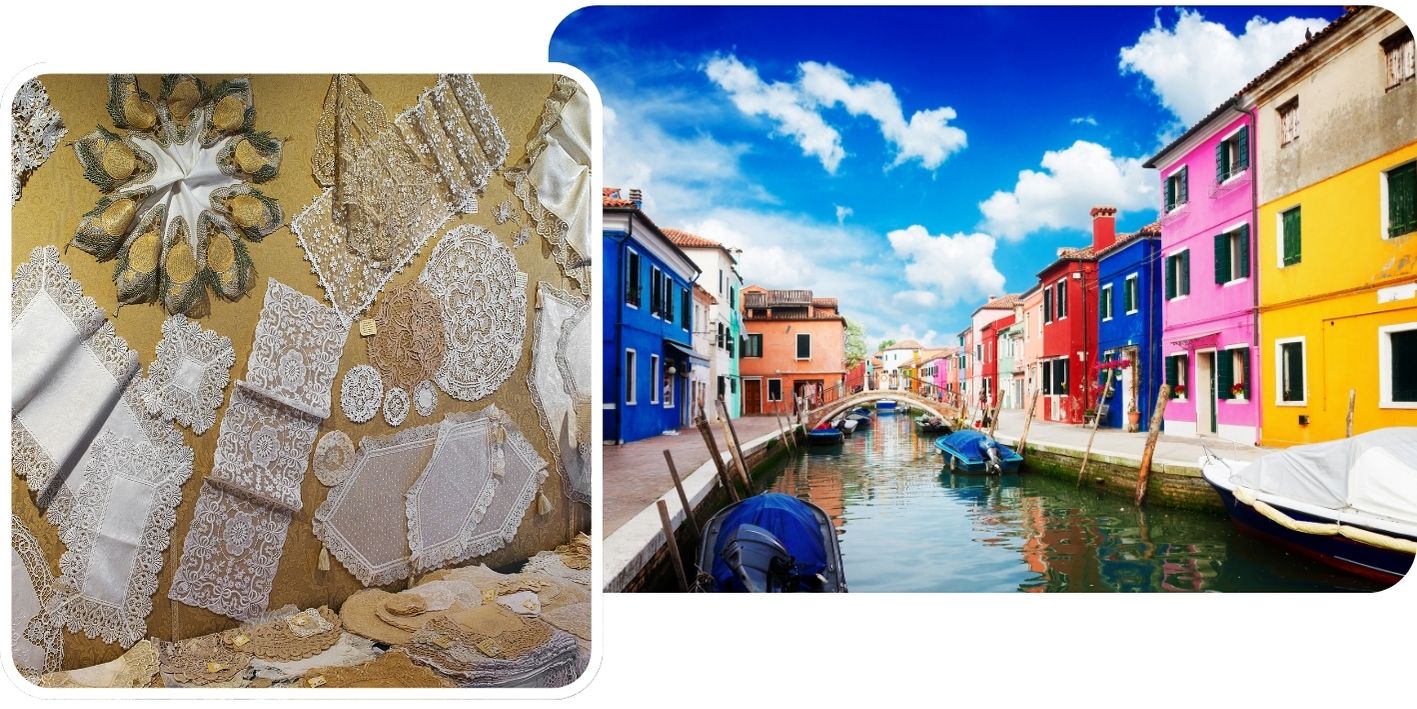 Rond de middag meert het schip aan bij Burano, beroemd om zijn felgekleurde huizen en traditionele kantwerk.