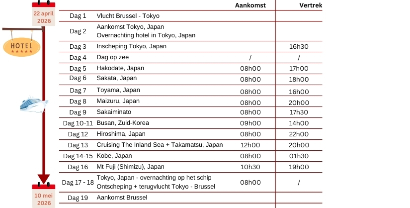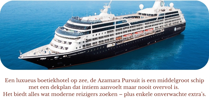 Internationale vluchten : Brussel – Tokio / Tokio – Brussel Transport van en naar de luchthaven en cruiseschip 1 overnachting in hotel **** te Tokio, Japan met ontbijt 16-daagse adembenemende cruise langs de mooiste aanleghavens van Japan en Zuid-Korea 15 nachten aan boord van het prachtige schip Azamara Pursuit Nederlandstalige begeleider gedurende de volledige reis Animatie, shows, fitnessruimte en entertainment aan boord Volpension tijdens cruise (ontbijt, lunch, diner in het à la carte restaurant) Fooien Azamazing Evening Uitgebreid drankenpakket Havengelden en Taxen Btw en garantiefonds