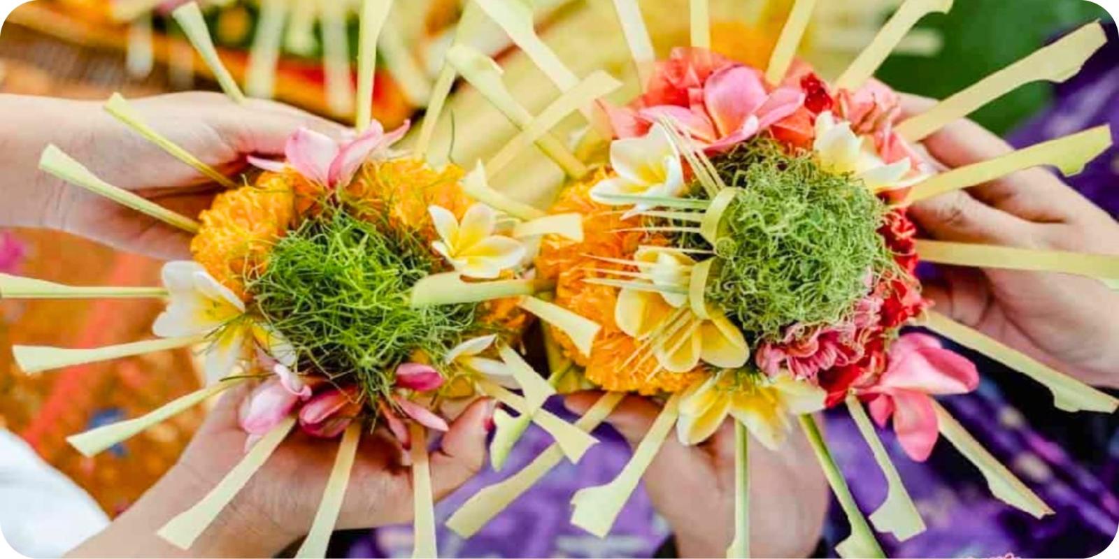 Om die balans te behouden, brengen ze dagelijks offers – kleine mandjes gemaakt van palmbladeren, gevuld met bloemen, rijst, koekjes, en wierook.