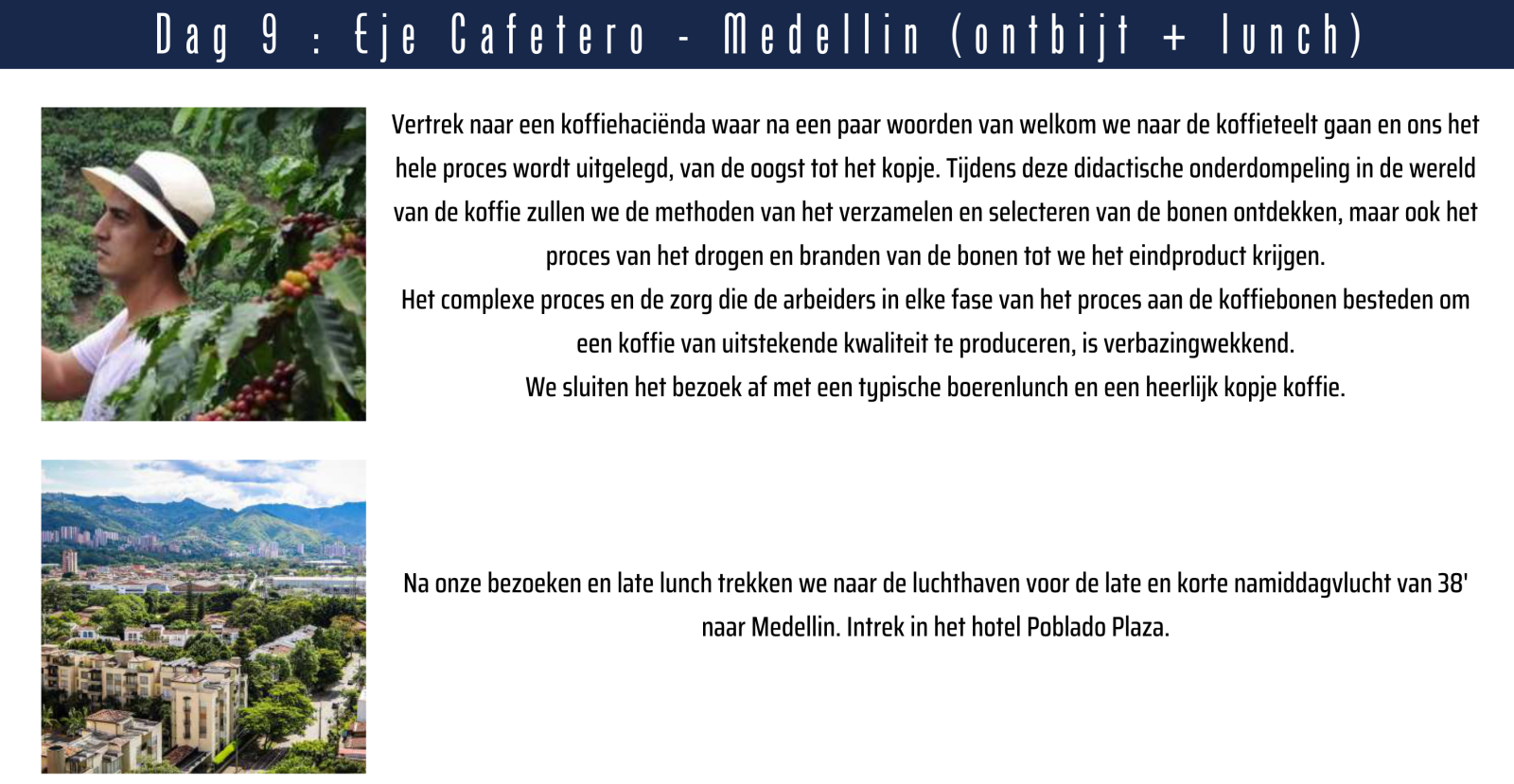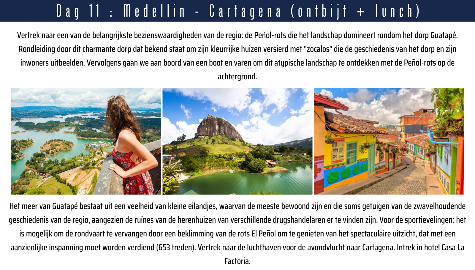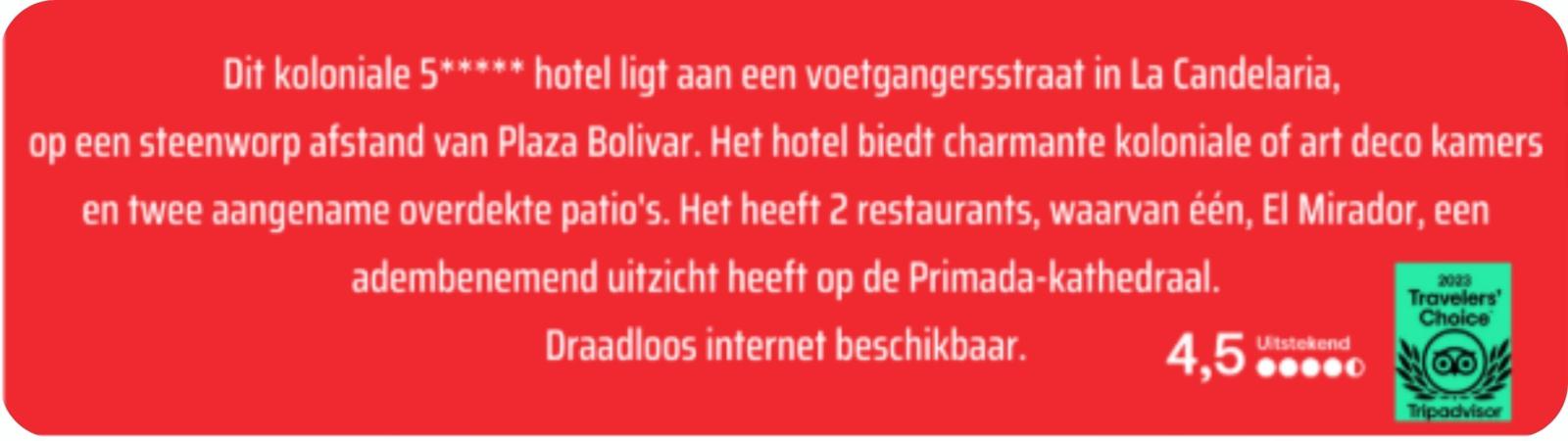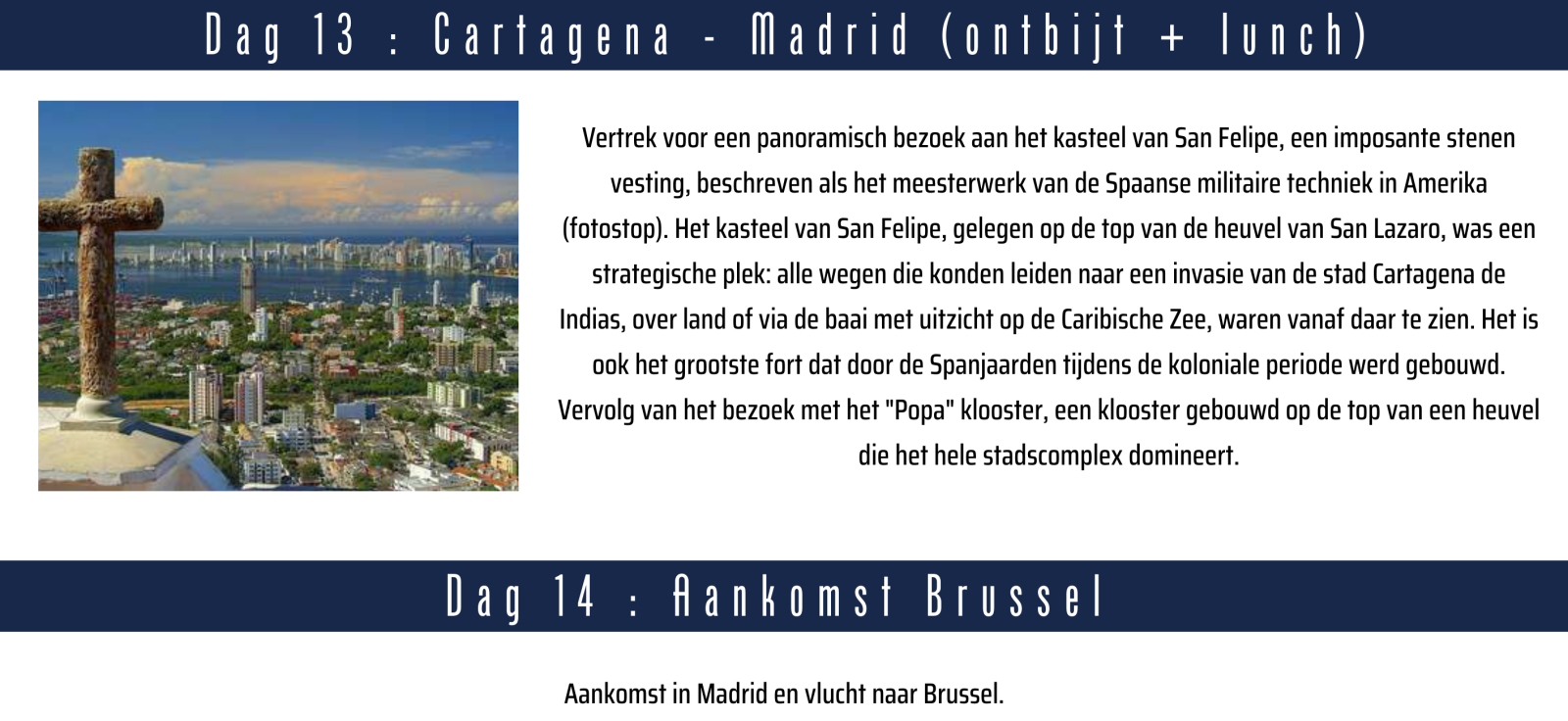* Vluchten vanuit Brussel * Maaltijden zoals vermeld in het programma (half pension + afscheidsdiner in Cartagena) * Alle vermelde bezoeken volgens het programma * Professionele, Nederlandstalige Colombiaanse gids ter plaatse * Vervoer met autocar ter plaatse * Knappe vier**** -en vijf***** hotels